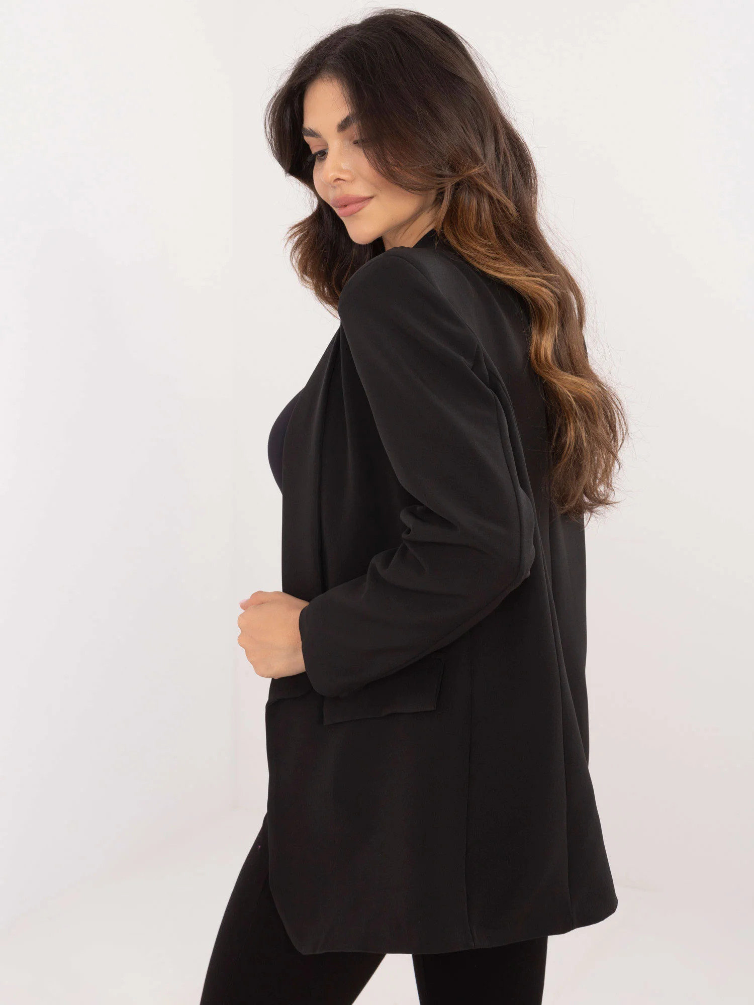 Wymiary marynarki w rozmiarze one size mierzone na płasko: szerokość pod pachami - 54 cm, długość rękawa - 55 cm, długość całkowita - 76 cm.