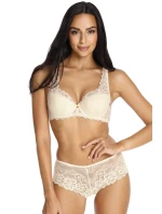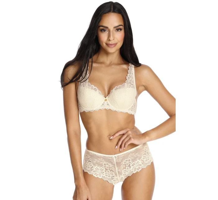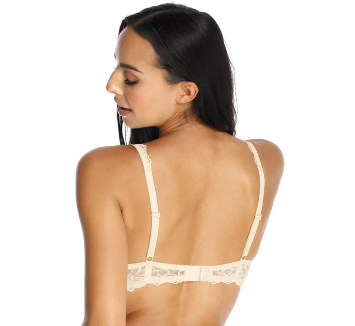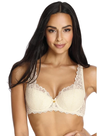 Podprsenka značky Mat, model 053/22 Carmela. Má drátky, které podpírají prsa a vhodně je tvarují. Výrobek má nastavitelná ramínka bez možnosti jejich odepnutí. Podprsenka se zapíná na háčky. Místo zapínání: na zádech. 2 řady svislých výšivek. 3 stupně vodorovných výšivek. Výrobek je vyroben ze 44 % polyamidu, 17 % bavlny, 17 % polyesteru, 17 % polyuretanu, 5 % elastanu. Vlastnosti výrobku: krajkový ženský krásný elegantní.