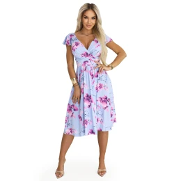 MATILDE midi šaty s obálkovým výstřihem a krátkými rukávy modré s růžovými květy model 22014770 - numoco