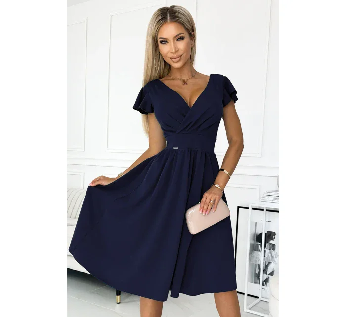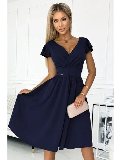 Tmavě modré dámské šaty s výstřihem a krátkými rukávy model 18703556 - numoco