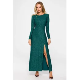 Jednoduché a chic - plesové šaty z třpytkové látky! Úzký top s dlouhými rukávy, vycpávkami na ramenou a velkým kulatým výstřihem, široká splývavá sukně s vysokým rozparkem. Třpytivý materiál.