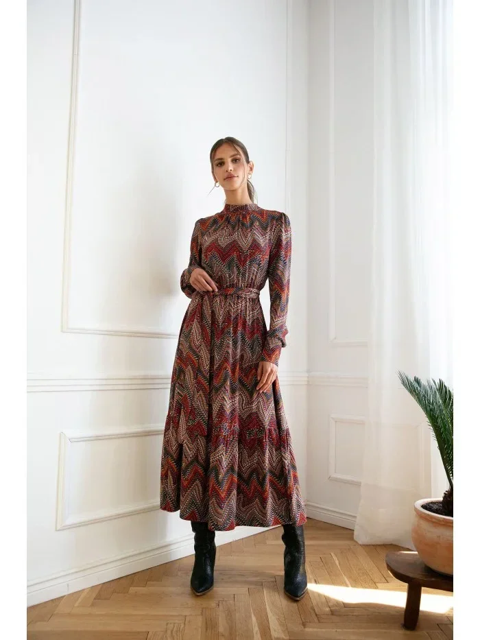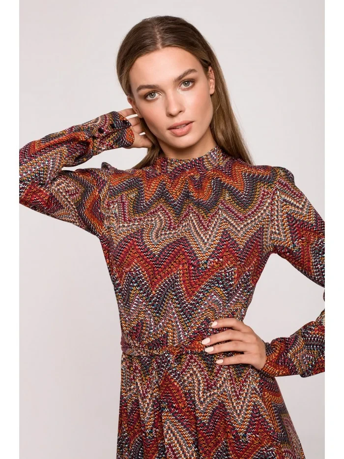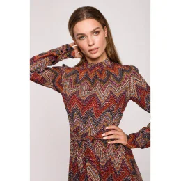 100% viskóza Maximální pohodlí, maximální elegance v podobě maxi šatů s aztéckým potiskem, nařaseným lemem a stojáčkem. Nejlépe se kombinují s vysokými botami. PODROBNOSTI O PRODUKTU: tkaný materiál s potiskem maxi šaty se stojáčkem a nařaseným lemem skrytý zip na zádech dlouhé rukávy s manžetami na knoflíky naše modelka měří 174 cm a nosí velikost S