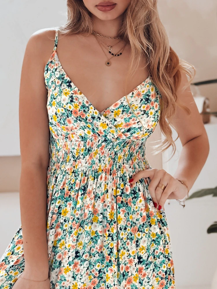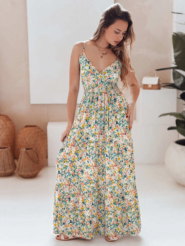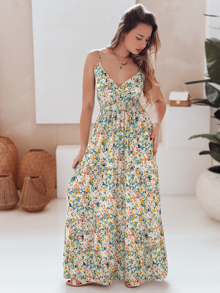 Długa sukienka na cienkich ramiączkach z bawełny, ozdobiona drobnym, kwiatowym printem i marszczeniem w talii, to idealny wybór na sezon wiosna-lato. Zapewnia swobodę ruchów, a lekki materiał świetnie sprawdza się w ciepłe dni. Styl romantyczny w nowoczesnym wydaniu.