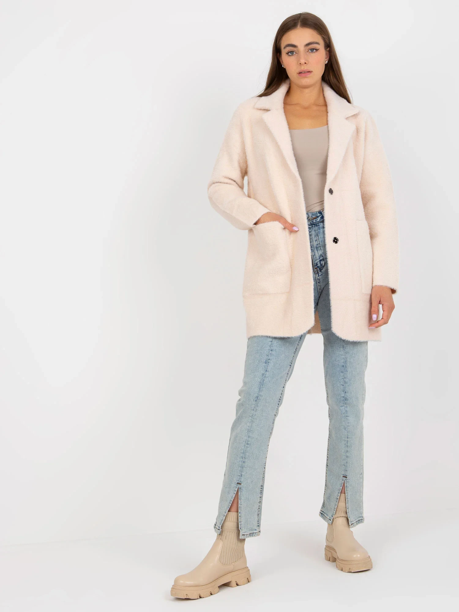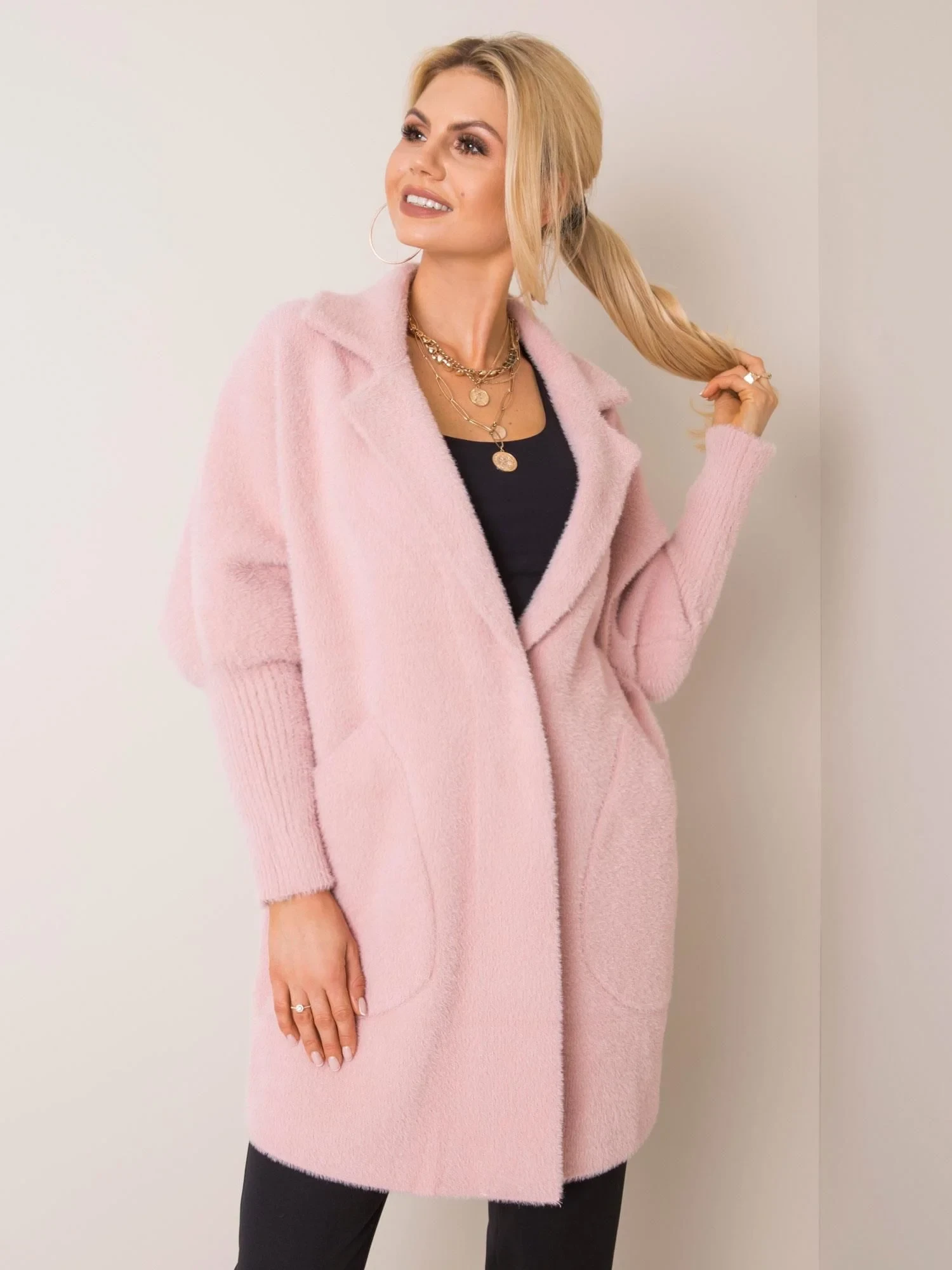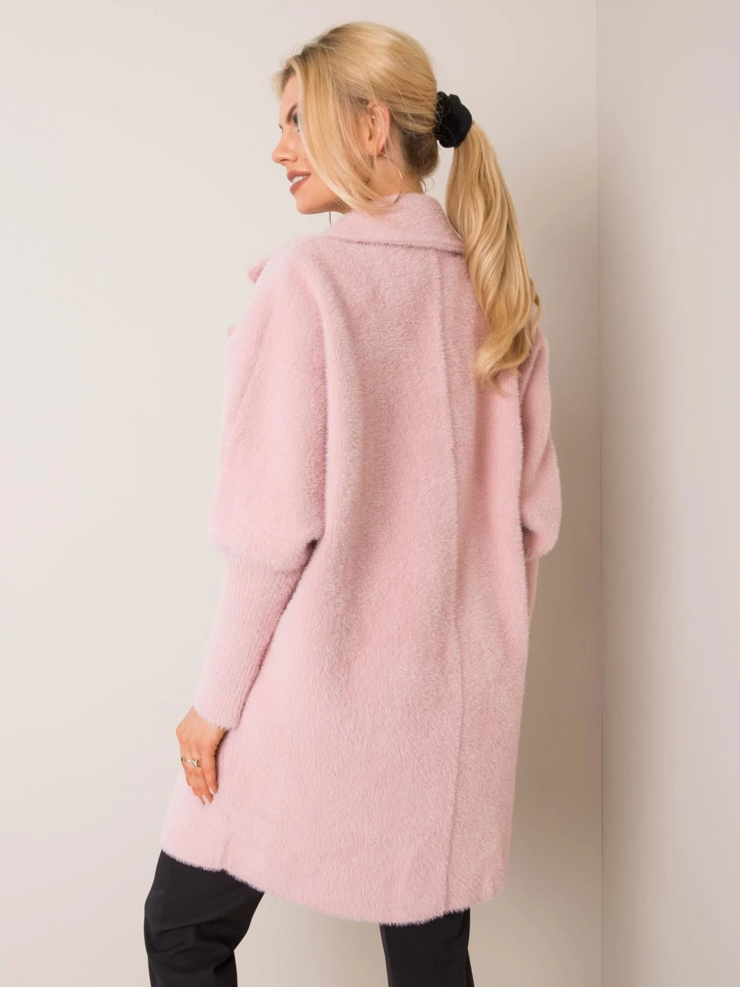 Pudrově růžový huňatý kabát z alpaky.