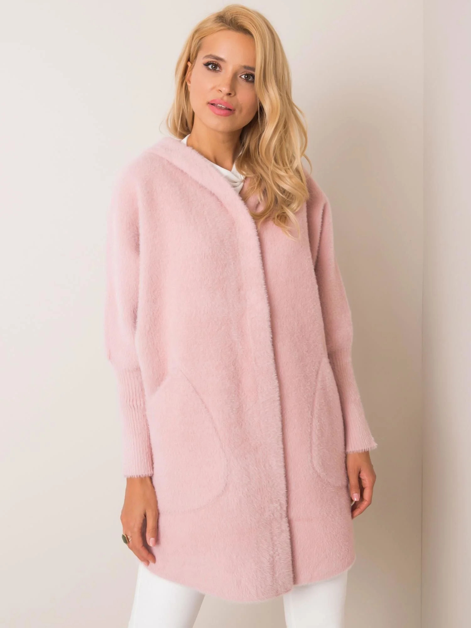 Jasnoróżowy płaszcz alpaka z kapturem.