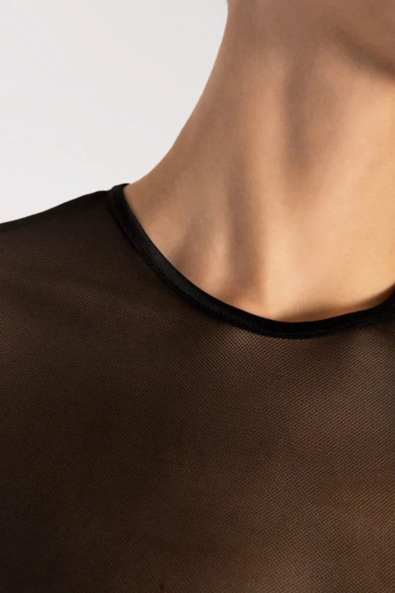 Toto elegantní body s dlouhými rukávy je vyrobeno z průhledného a pružného síťovaného úpletu, který mu dodává smyslný a jemný charakter.Má jemnou a vzdušnou strukturu.Smyslný průhledný úplet zdůrazňuje ženské tvary a zároveň zaručuje dokonalé přizpůsobení siluetě a vysoký komfort při nošení.Materiály použité při výrobě pocházejí od renomovaných evropských výrobců, což zaručuje vysokou kvalitu a odolnost výrobku.