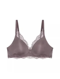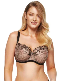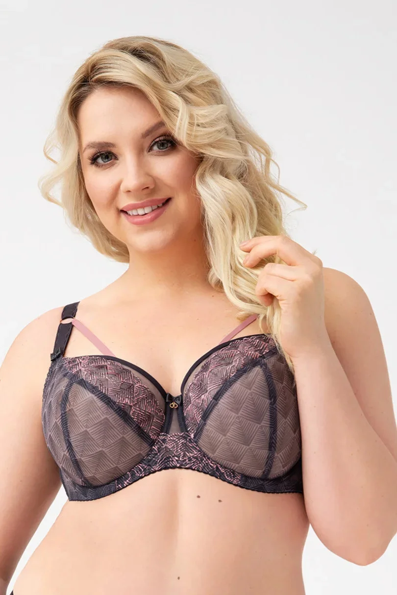 Spodní část košíčků tvoří stabilní potištěný tyl, který je podšitý šedým tylem. Vrchní část košíčků tvoří výšivka s potiskem, která je podšitá tylem. Vrchní okraj košíčků lemuje pružná páska. Obvod je vyrobený ze stabilního tylu a z transparentní lycry s vysokou gramáží. Můstek tvoří dvojitá vrstva tylu s potištěnou výšivkou. Vrchní i spodní okraj obvodu lemuje hladká, pružná, jemně vroubkovaná páska. Košíčky jsou vytvarované drátky. Drátky jsou ve větších velikostech širší, a proto lépe udržují poprsí. Na bocích modelu jsou ploché kostice, díky kterým podprsenka ideálně přiléhá k tělu. Hladká ramínka mají šířku 14, 18, nebo 22 mm. Kovová kolečka a regulátory mají barvu "rose gold" a neobsahují nikl. Obvod se nastavuje dvou, nebo třířadovými háčky. Podprsenka se 14 mm ramínky se zapíná dvouřadovými háčky. Podprsenky s 18 a 22 mm ramínky se zapínají třířadovými háčky.