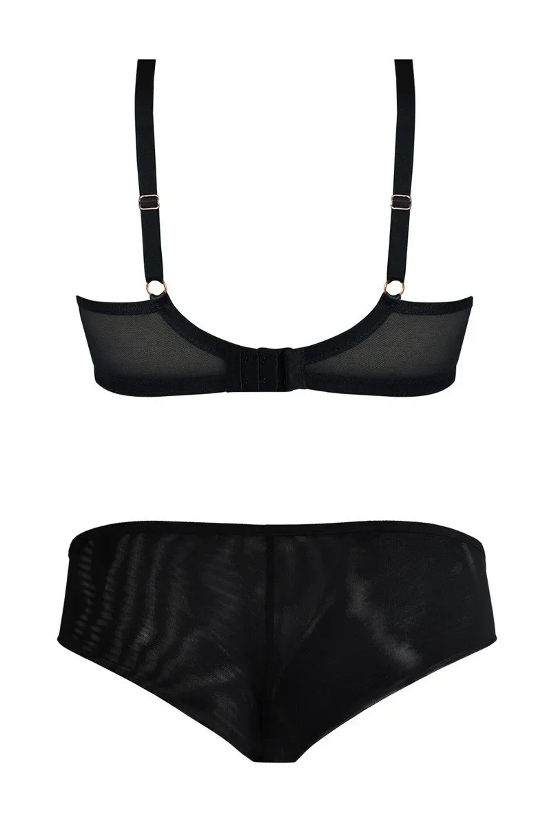Vrchní část košíčků je ozdobená jemnou výšivkou. Košíčky jsou vyrobené ze dvou vrstev síťoviny. Ve spodní části má síťovina černou barvu a nahoře barvu mocca. Díky barevnému provedení podprsenka neprosvítá. Model zdobí regulátory a ozdoba ve středu podprsenky v barvě "golden rose". Pěkný komplet je možné vytvořit s plnými kalhotkami, nebo kalhotkami typu brazilky.