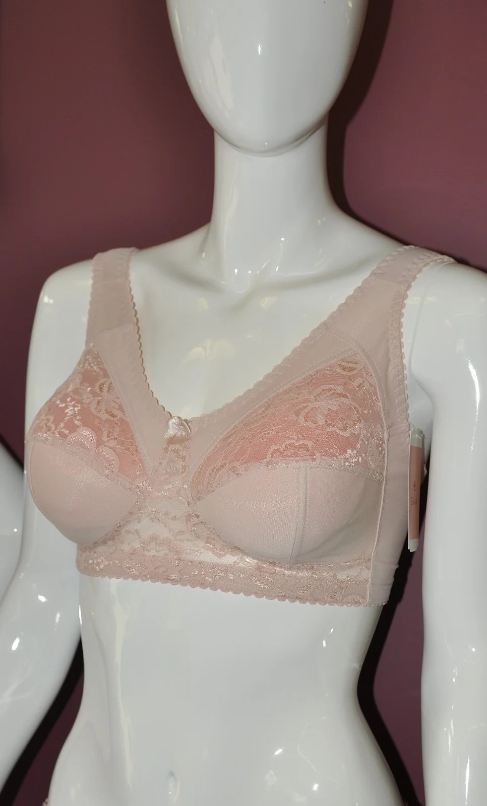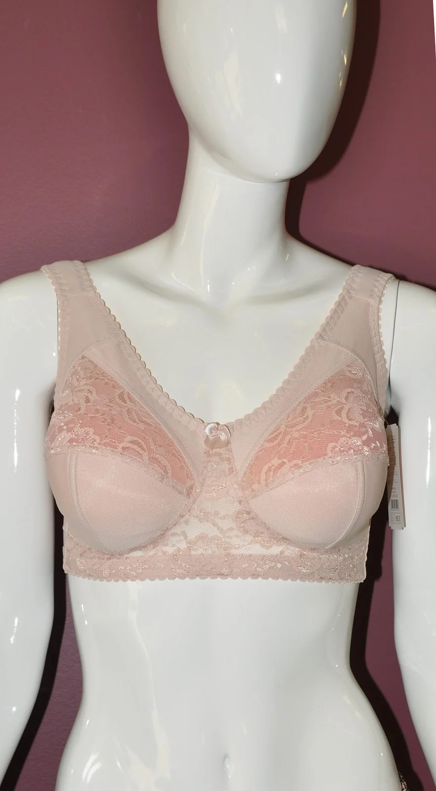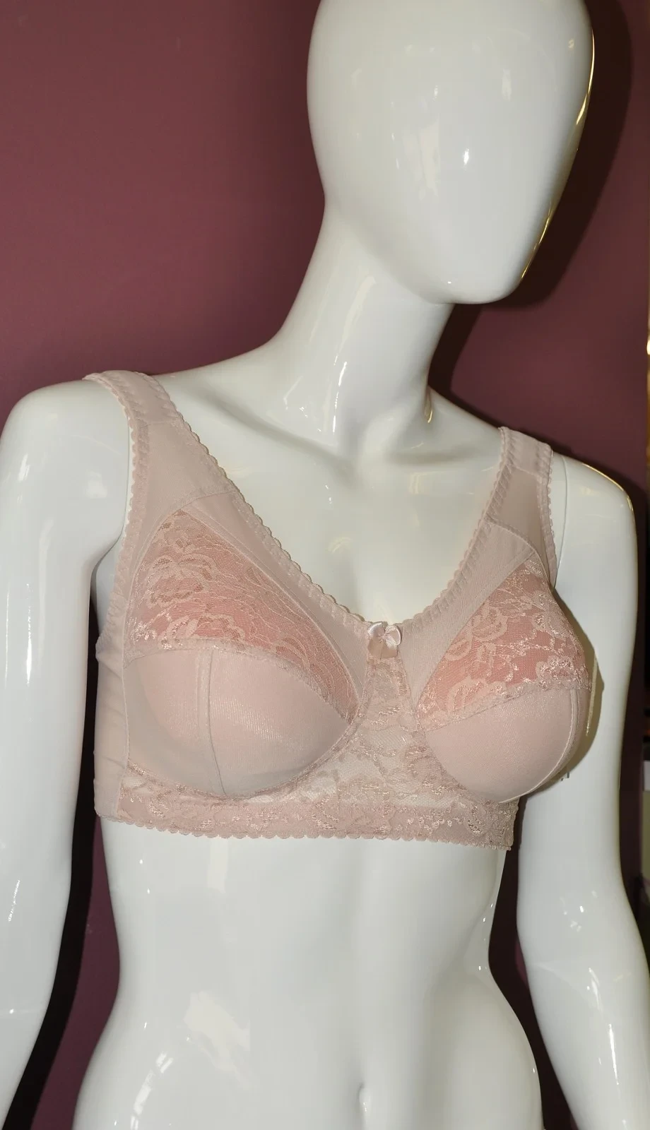 Měkké košíčky nemají kostice. Podprsenka je vyrobená ze síťoviny a je do poloviny podšitá tkaninou. Horní část košíčků je průsvitná a je ozdobená krajkou. V místě spojení košíčků je saténová mašlička. Pohodlná široká ramínka jsou zárukou komfortu při nošení.