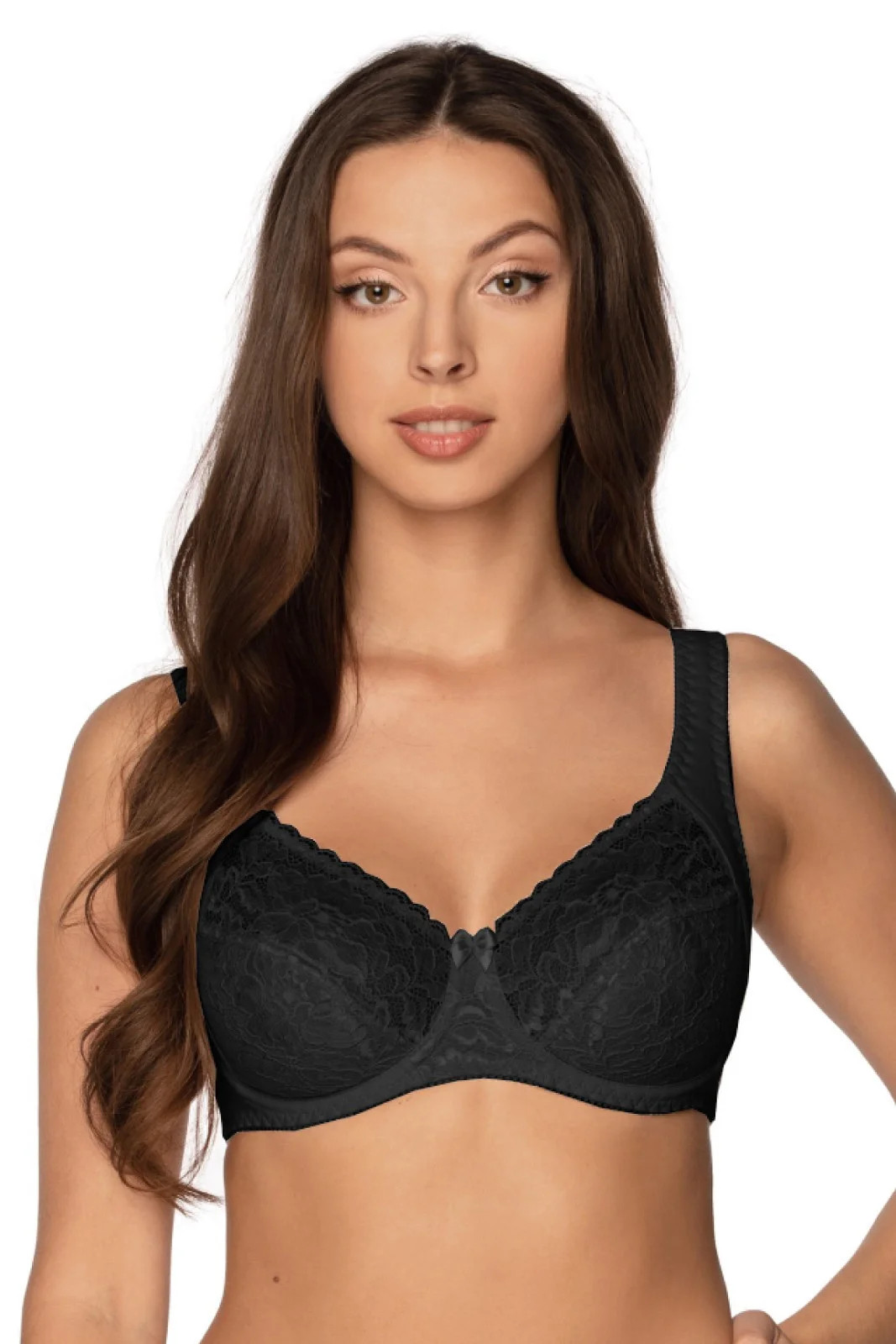 Spodní část košíčků je podšitá materiálem. Vrchní část košíčků lemuje ažurová krajka. Boční panely pěkně stahují poprsí ke středu hrudníku. Model je vhodný pro ženy s větším poprsím. Podprsenka se zapíná dvěma, nebo třemi háčky s trojí možností nastavení délky obvodu.