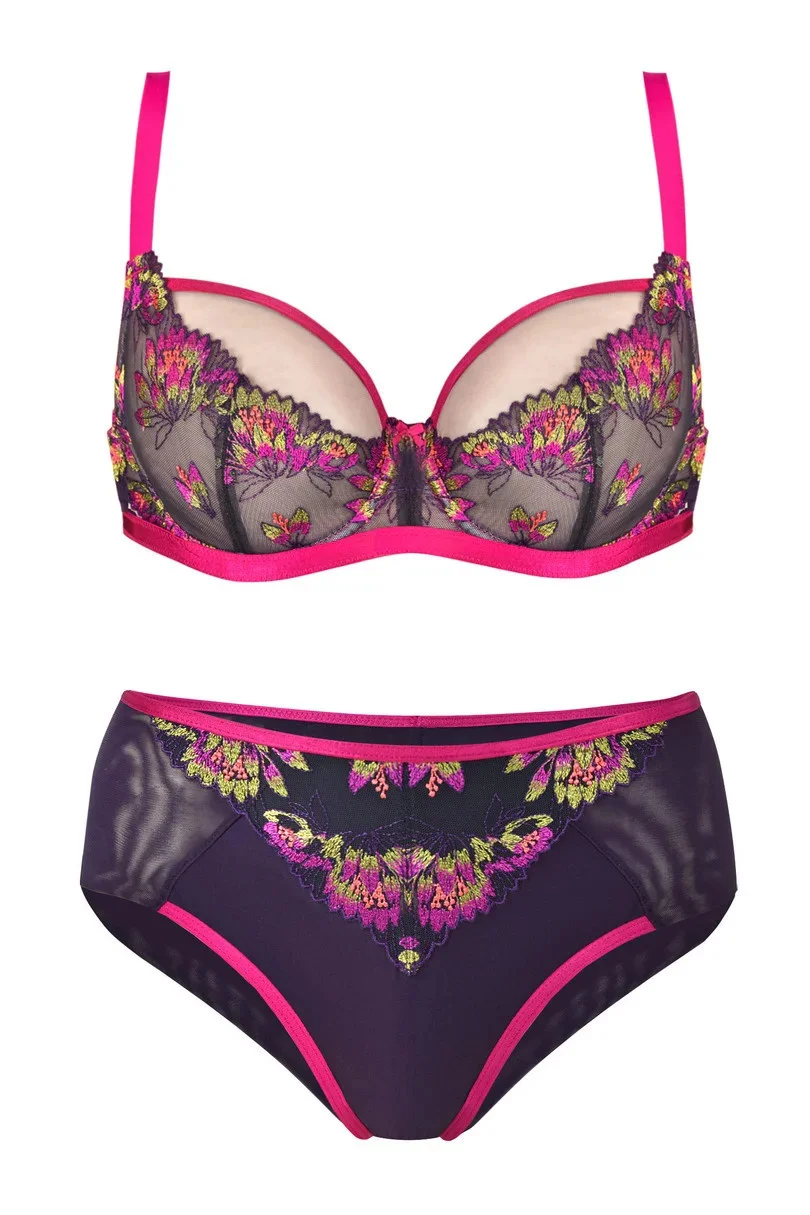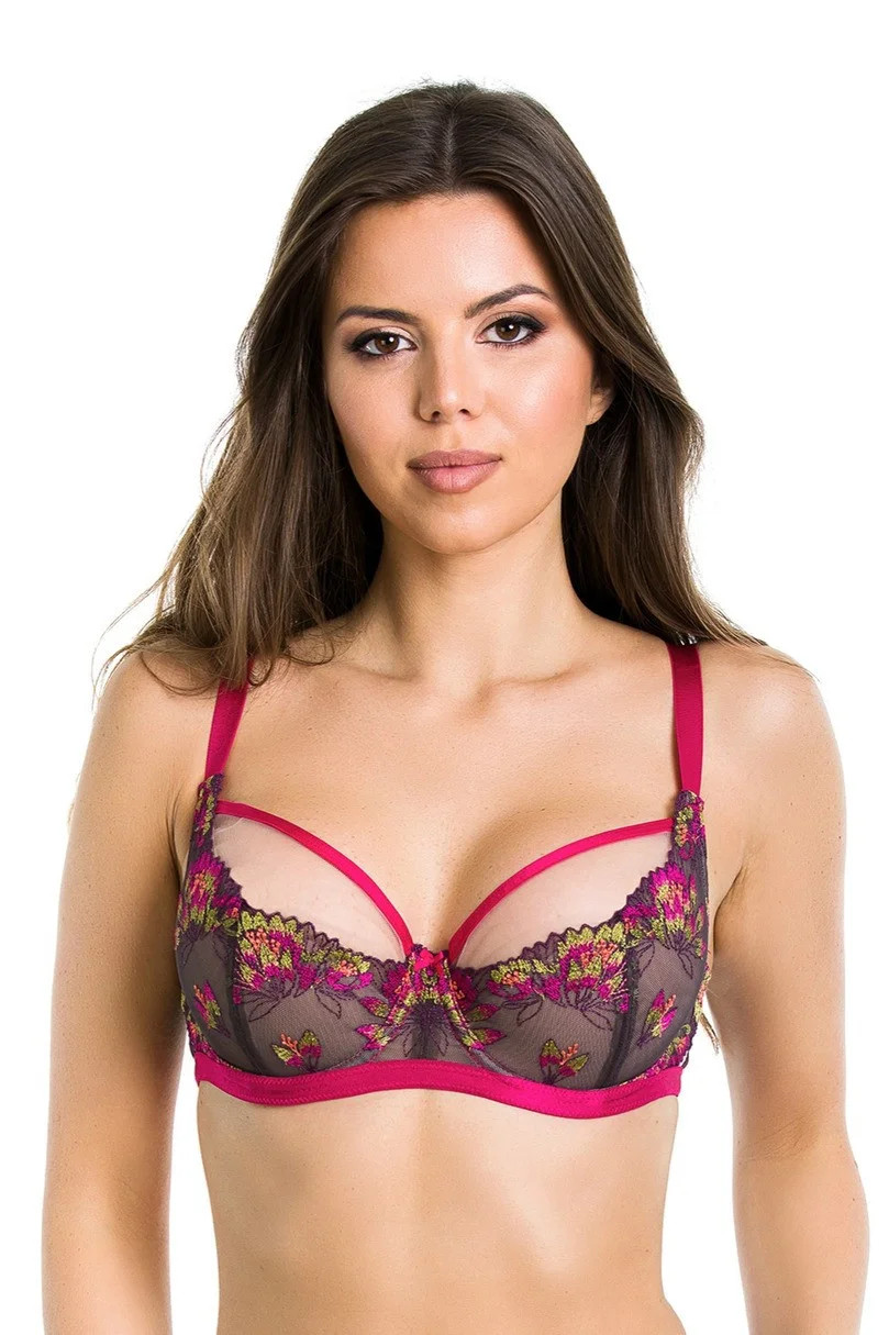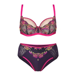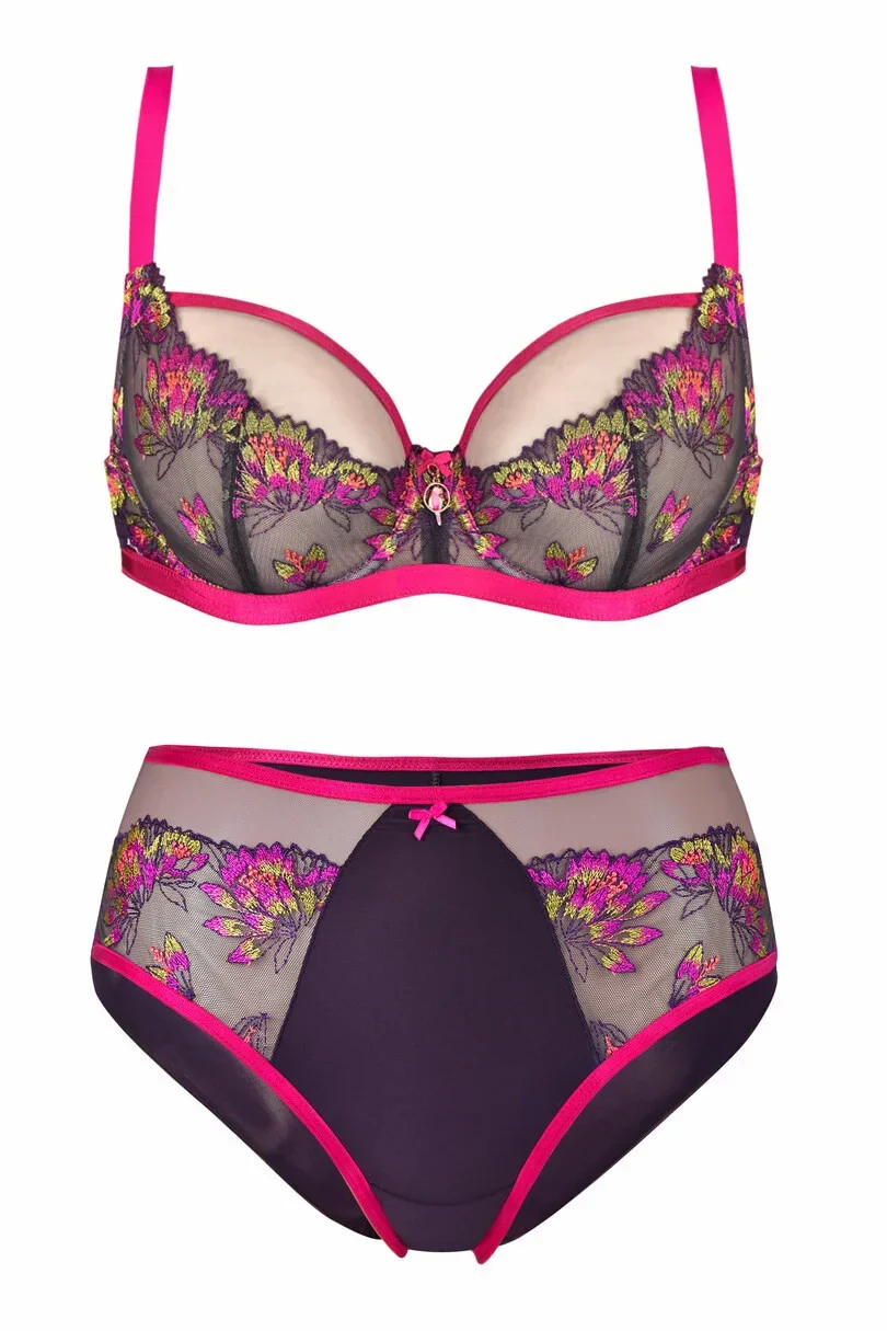 Ve spodní části košíčků je úžasná barevná výšivka. Vrchní část košíčků je tylová a je olemovaná lemovkou v amarantové barvě. V obvodu je páska v amarantové barvě. Ramínka není možné odepnout. Ve středu modelu je ozdobná mašlička.