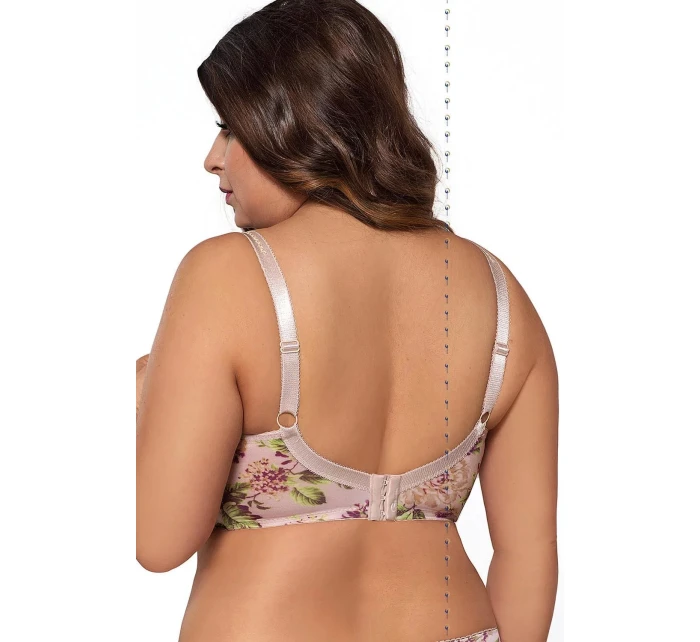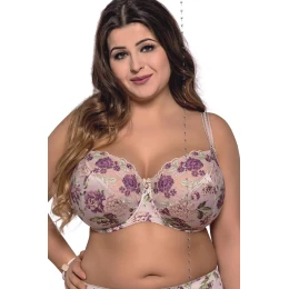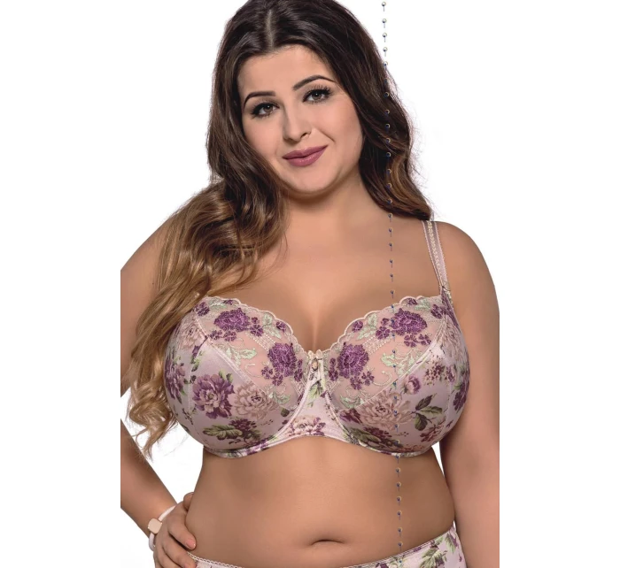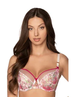 Krásná měkká podprsenka v podzimních barvách - světlé růžové spojené s vřesovou fialovou a zelenou.Košíčky tohoto modelu krásně obepínají poprsí a udržují jej na správném místě. Zároveň vytváří krásný dekolt, který zvýrazňují.Spodní část košíčků je vyrobená z pevnější látky potištěné květinovým motivem. Horní část košíčků pokrývá výšivka, která je podšitá jemnou síťovinou. Můstek tvoří stejná látka, která byla použita na spodní část košíčků. Boky jsou ušité z pružné lycrové látky, která je taktéž potištěná květinovým vzorem a která se při nošení nevytahuje.Ve středu podprsenky, mezi košíčky, je umístěná mašlička s ozdobným přívěskem.Ramínka tohoto modelu je možné nastavit, ale nelze je odepnout. Jejich šířka závisí na rozměru a velikosti podprsenky. V místech, kde se ramínka spojují s košíčky, jsou umístěné malé mašličky a ramínka zdobí aplikace z plastické krajky ve tvaru bublinek.Model je doplněný o svislé boční kostice a zapíná se na dvou nebo třířadové háčky (v závislosti na rozměru) s třístupňovou možností nastavení obvodu.Složení: 90 % polyamid, 7 % elastan, 3 % polyester.