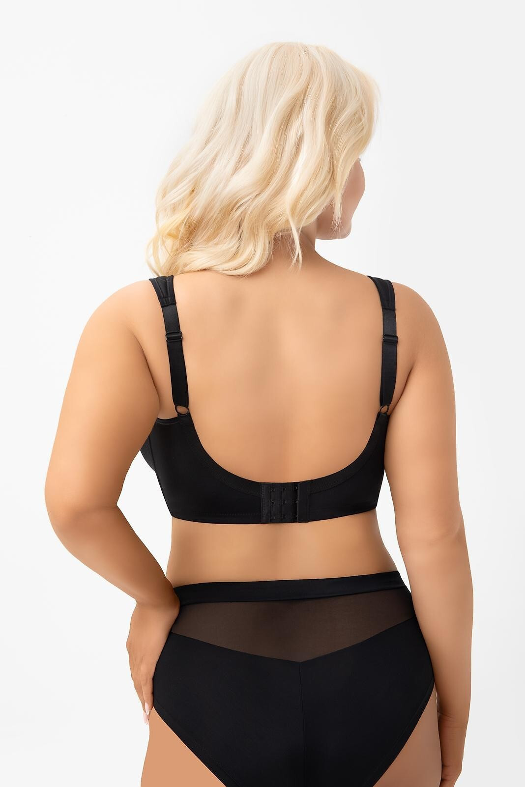 - dla zwiększenia komfortu użytkowania biustonosz na plecach wykończony szeroką, miękką elastyczną taśmą
