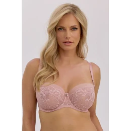 Měkká podprsenka Nia Art. 1343 je kombinací jemné elegance a pohodlí, která potěší svou ženskostí. Je vyrobena z jemné krajky v odstínu pudrově růžové a okouzlí svou lehkostí a jemností. Měkké košíčky decentně obepínají poprsí, čímž zajišťují přirozený tvar a dokonalé přizpůsobení. Průhledná horní část košíčků dodává prádlu lehkost, zatímco kostice a rafinovaná struktura zaručují dokonalou oporu. Malá mašlička s bižuterním akcentem mezi košíčky dodává šarm a úroveň.