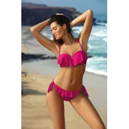 If you dream of large, firm, sexy breasts, beautifully gathered to the cleavage - this proposal is just for you. The swimsuit looks sweet and innocent, available in many, attractive colours, and each in a great, soft, elastic fabric. The bra is distinguished by a great design intended for smaller and medium-sized breasts - it is padded and has a rather large push up filling, permanently placed in the bra. Adjustable length straps, detachable, ideal for sunbathing the body. The waistband is fastened with a buckle. The panties are sexy, tied at the sides brazylians with a frill at the top. For the full effect, the panties should be pulled firmly towards the top of the hips, so that their triangular shape nicely decorates the bottom, which partially extends beyond the contour of the panties.