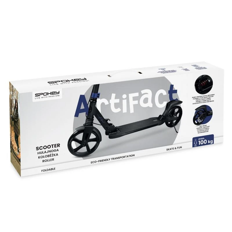 Artifact to wyjątkowo komfortowa i funkcjonalna hulajnoga miejska, która spełni oczekiwania amatorów dwóch kółek na każdym poziomie zaawansowania. Dzięki regulowanej wysokości kierownicy, amortyzatorom oraz dużym kołom, poruszanie się na tym jednośladzie po miejskich przestrzeniach, będzie przyjemne i efektywne. To świetna ekologiczna alternatywa dla innych środków miejskiego transportu. Kluczowe cechy: Regulowana wysokość kierownicy: dostosowanie do wzrostu użytkownika (90-95-105 cm). Podwójny system hamulców: nożny i ręczny (tarczowy) zapewniają pełną kontrolę nad prędkością. Amortyzacja przednia i tylna: redukcja drgań podczas jazdy po nierównościach. Duże koła 200 mm i łożyska ABEC-9: płynność ruchu oraz łatwe osiąganie dużych prędkości. Antypoślizgowy deck: gwarancja stabilności i bezpieczeństwa podczas jazdy. Kompaktowość: łatwe składanie i transport, wygodne przechowywanie. Miejska hulajnoga Artifact posiada podwójny system amortyzacji (przód i ty