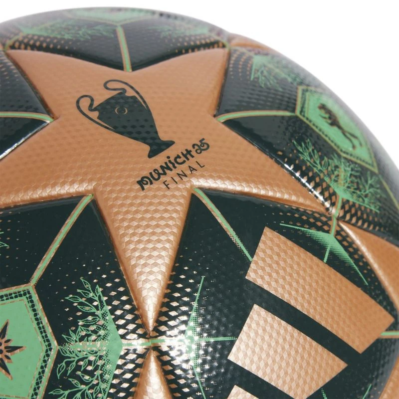 Míč adidas League v zelené barvě s mnichovskou kopulí pokrytou patinou a na pozadí pohlednice čerpá inspiraci z designu oficiálního míče pro zápasy Ligy mistrů UEFA.