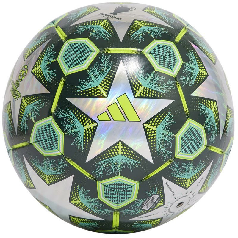 Tréninkový míč adidas v zelené barvě typické pro patinou pokryté měděné kopule Mnichova a pohlednicové pozadí čerpá inspiraci z designu oficiálního zápasového míče Ligy mistrů UEFA. Strojově šitý potah z TPU se osvědčí během intenzivních tréninků, na kterém jsou vidět propracované detaily týkající se města a loga turnaje. Speciální hologramový efekt dodává celému míči osobitý vzhled.