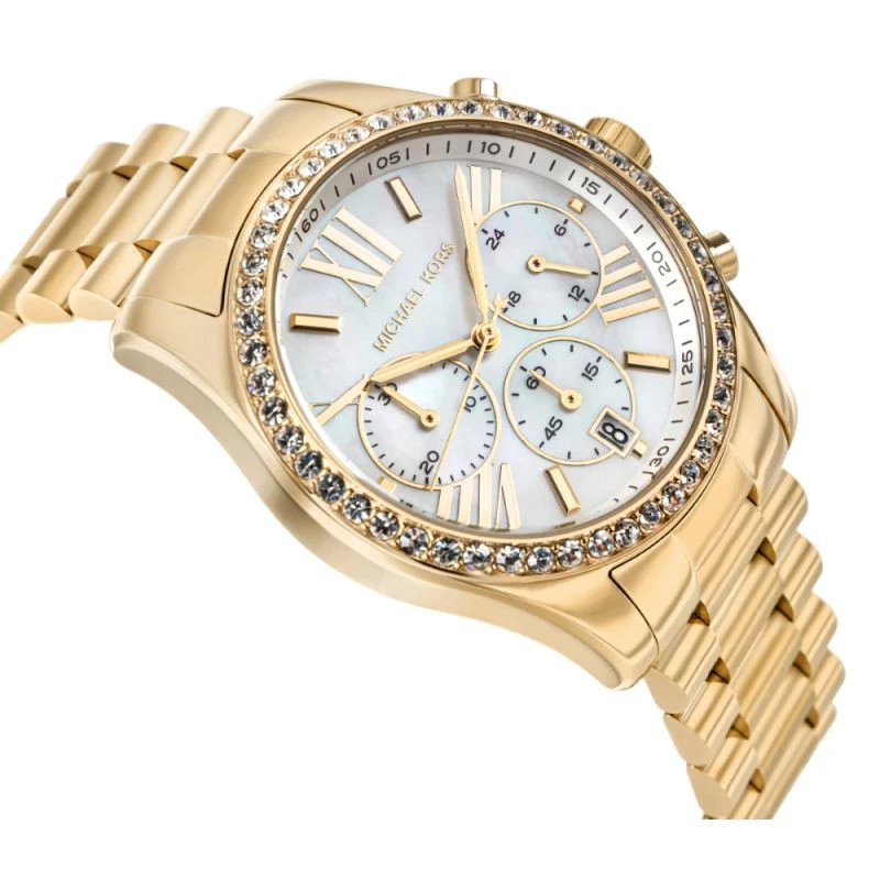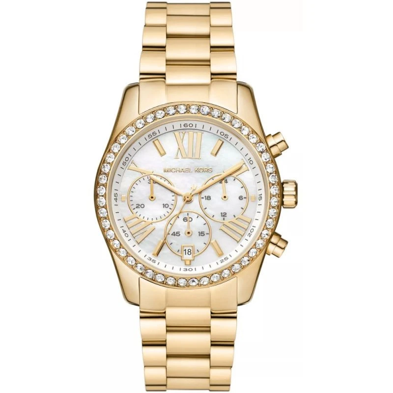 Dámské hodinky Michael Kors Lexington MK7241 jsou typickým příkladem luxusu a nadčasového stylu. Hodinky v klasickém zlatém odstínu zaujmou na první pohled svým jemným leskem a elegantním provedením. Kulaté pouzdro a sladěný náramek z nerezové oceli tvoří celek připomínající šperk, který dodá každému vzhledu punc noblesy. Perleťový ciferník s indexy a funkcí chronografu kombinuje styl a praktičnost, zatímco ozdobný rámeček kolem ciferníku dodává hodinkám jedinečný charakter. Hodinky Michael Kors Lexington MK7241 pohání přesný quartzový strojek, který zaručuje spolehlivý výkon den co den. Ideální volba pro ženy, které rády září na úrovni - elegantní, sofistikované a vždy módní.