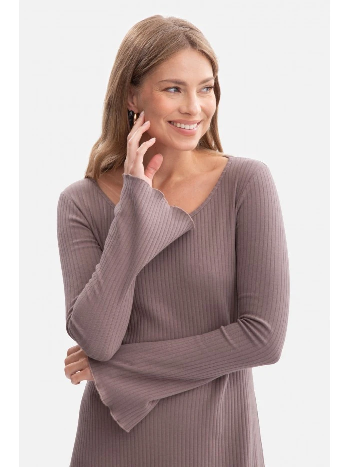 95% bavlna 5% elastan MATERIÁL Materiál: žebrovaný úplet, hmotnost 250 g PODROBNOSTI O PRODUKTU Zapínání: žádné - slip-on styl Límec: žádný, kulatý výstřih, mírně nabraný Kapsy: žádné Rukávy: dlouhé, mírně rozšířené na manžetách Detaily: jemně nařasený lem a manžety Podšívka: žádná Model: B308 Navrženo a vyrobeno v Polsku z látky vyrobené v Polsku Modelka na fotografii měří 171 cm a má na sobě velikost S/M STYL A STŘIH Střih: uvolněný, mírně rozšířený Tvar: vypasovaný top, rozšířená sukně Délka: midi, do půli lýtek