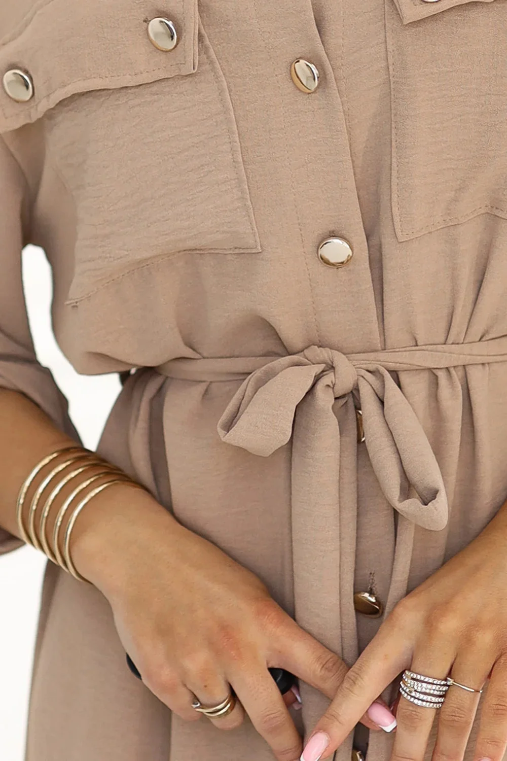 Midi schmisserie v módní moka mousse barvě se zlatými knoflíky, zavazováním v pase a 3/4 rukávy. elegantní košilový střih, ideální pro každou příležitost. značka Numoco Basic.