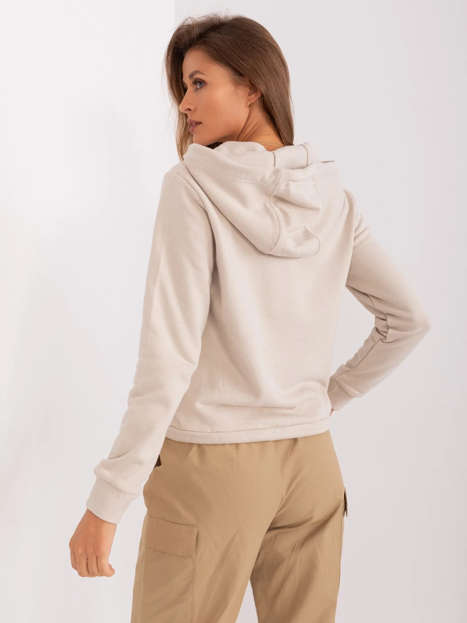 Béžová mikina s kapucí a stahovací šňůrkou .