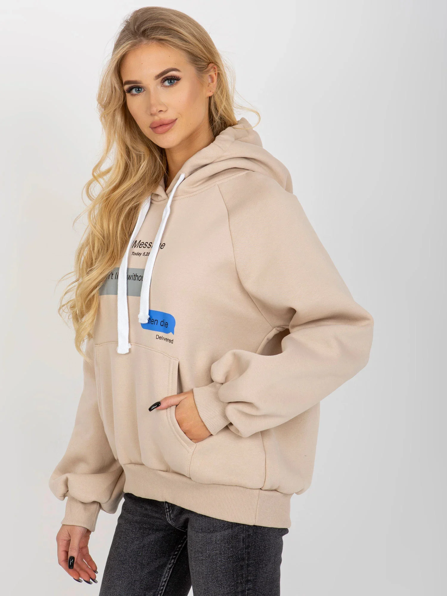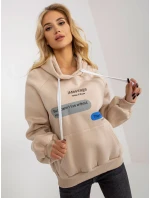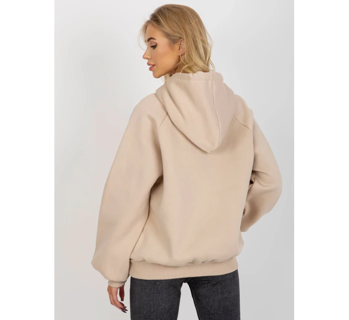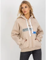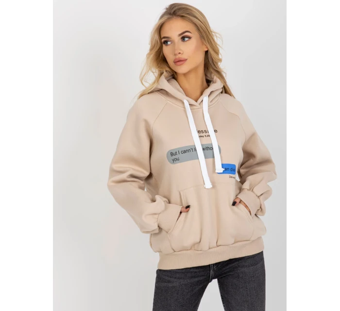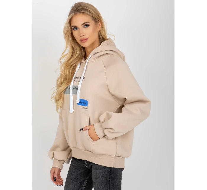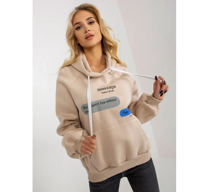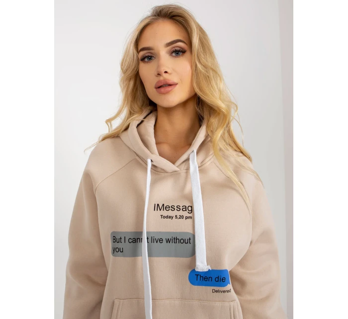 Béžová mikina s potiskem a kapucí .