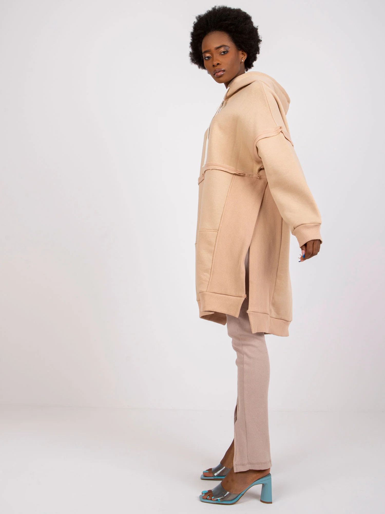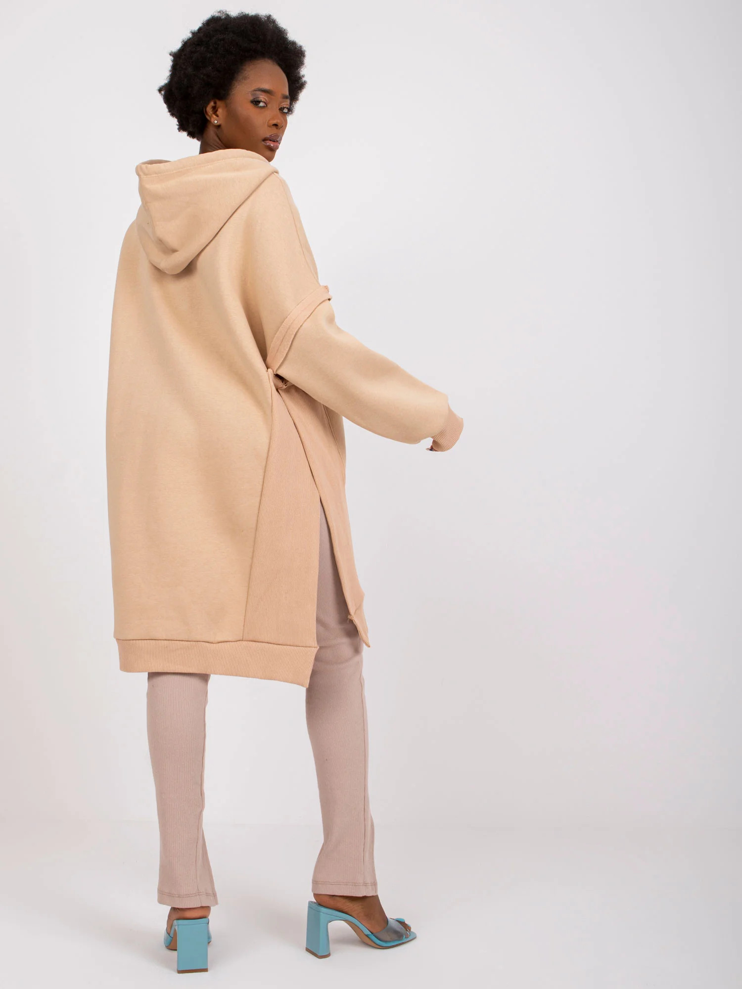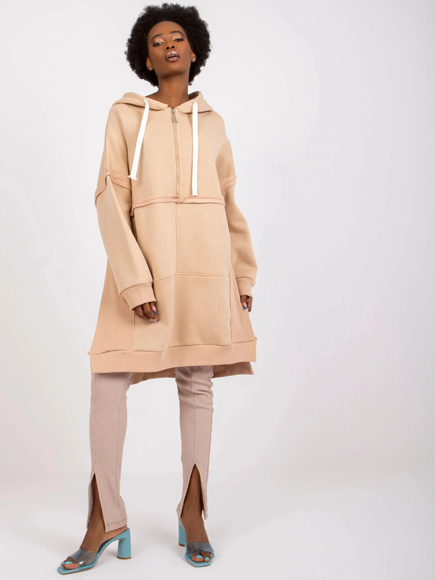 Světle modrá dlouhá mikina klokanka s kapucí .