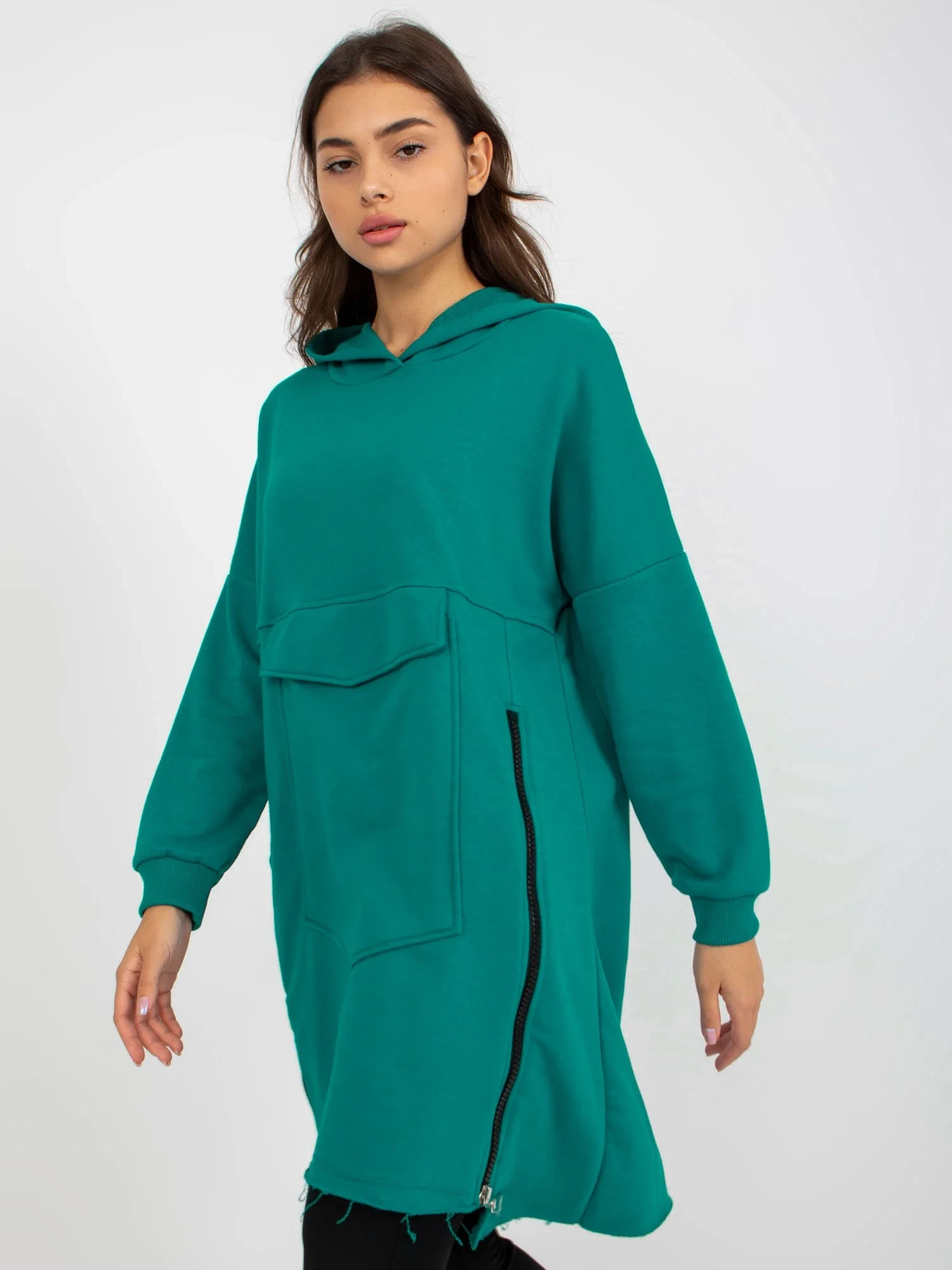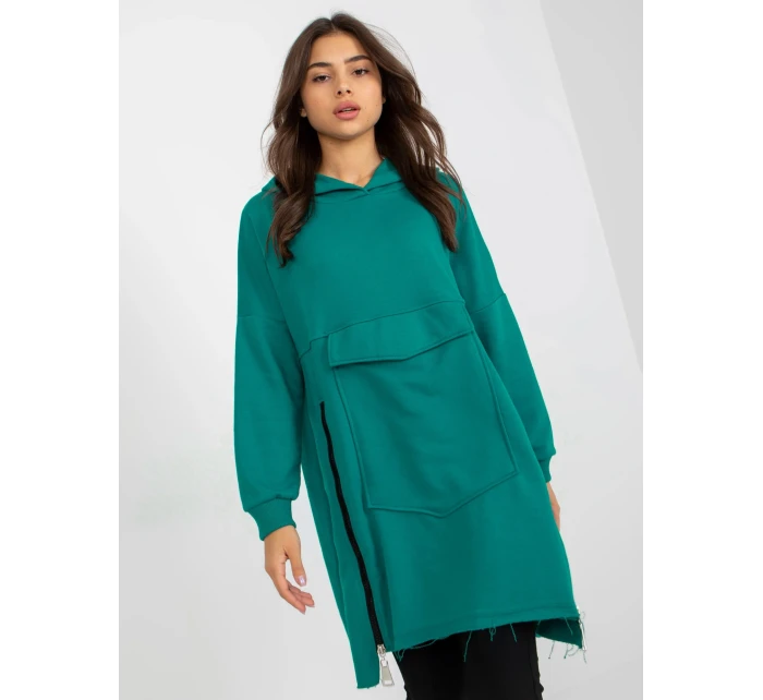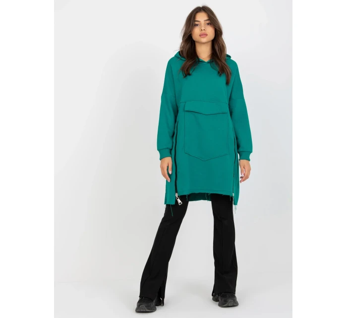 Světle modrá dlouhá mikina klokanka s kapucí .