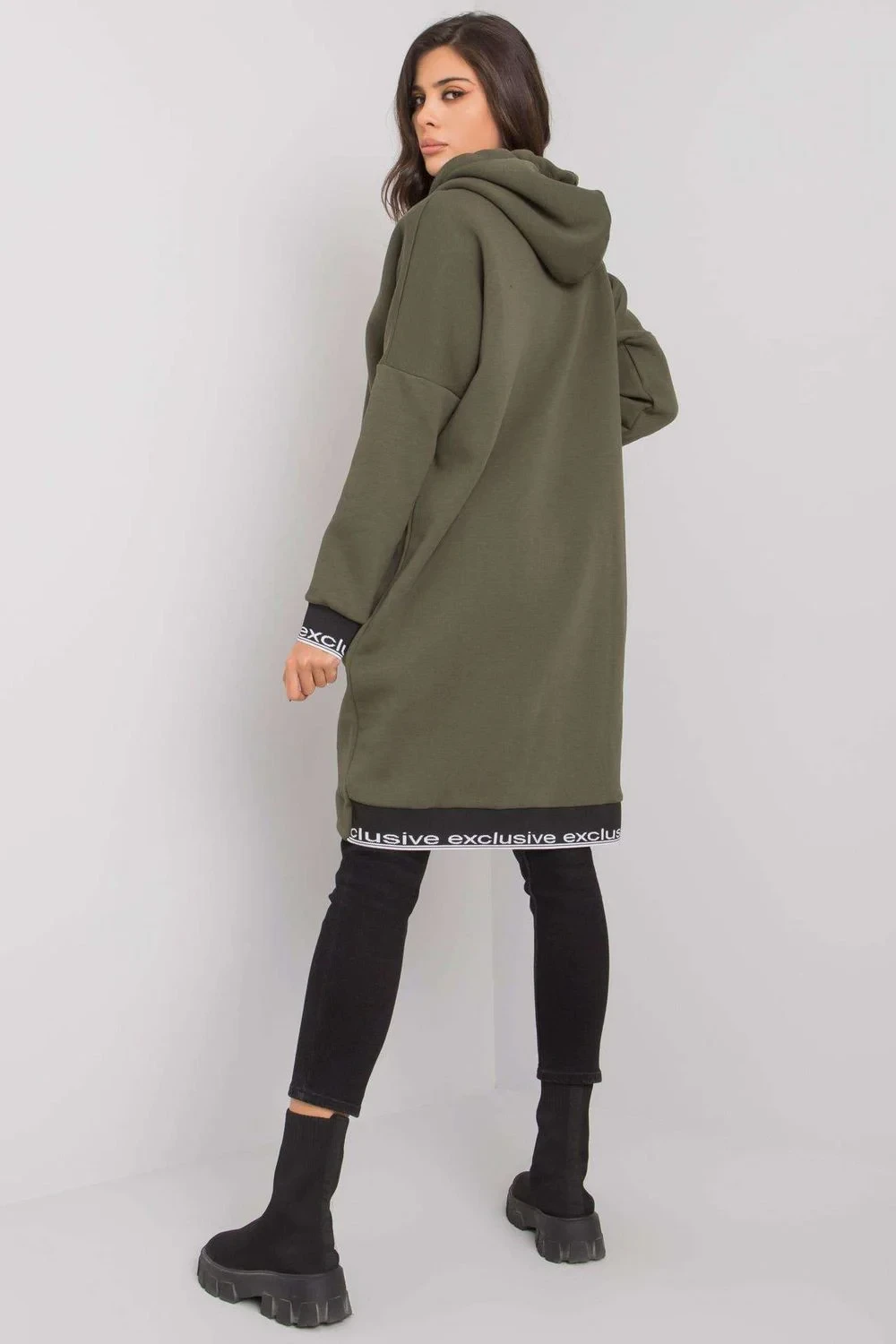 Dámská prodloužená mikina na zip v khaki barvě. Mikina má kapuci a nakládané kapsy.
