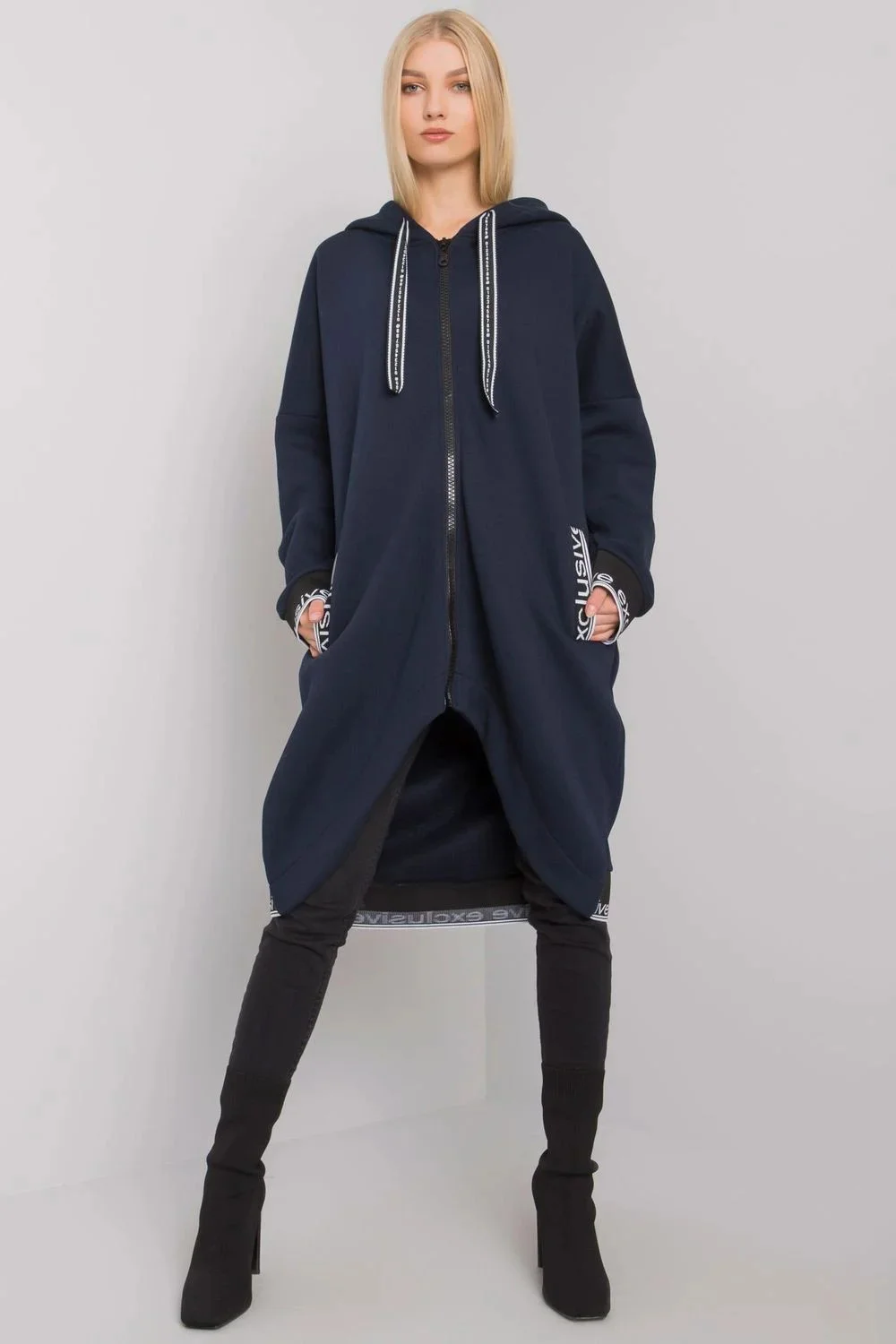 Dámská tmavě modrá prodloužená mikina na zip. Mikina má kapuci a nakládané kapsy.