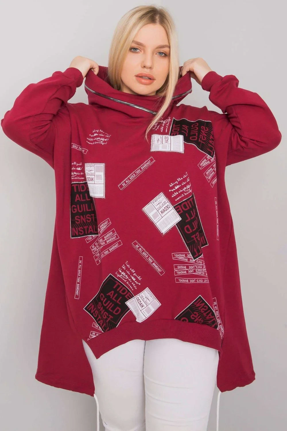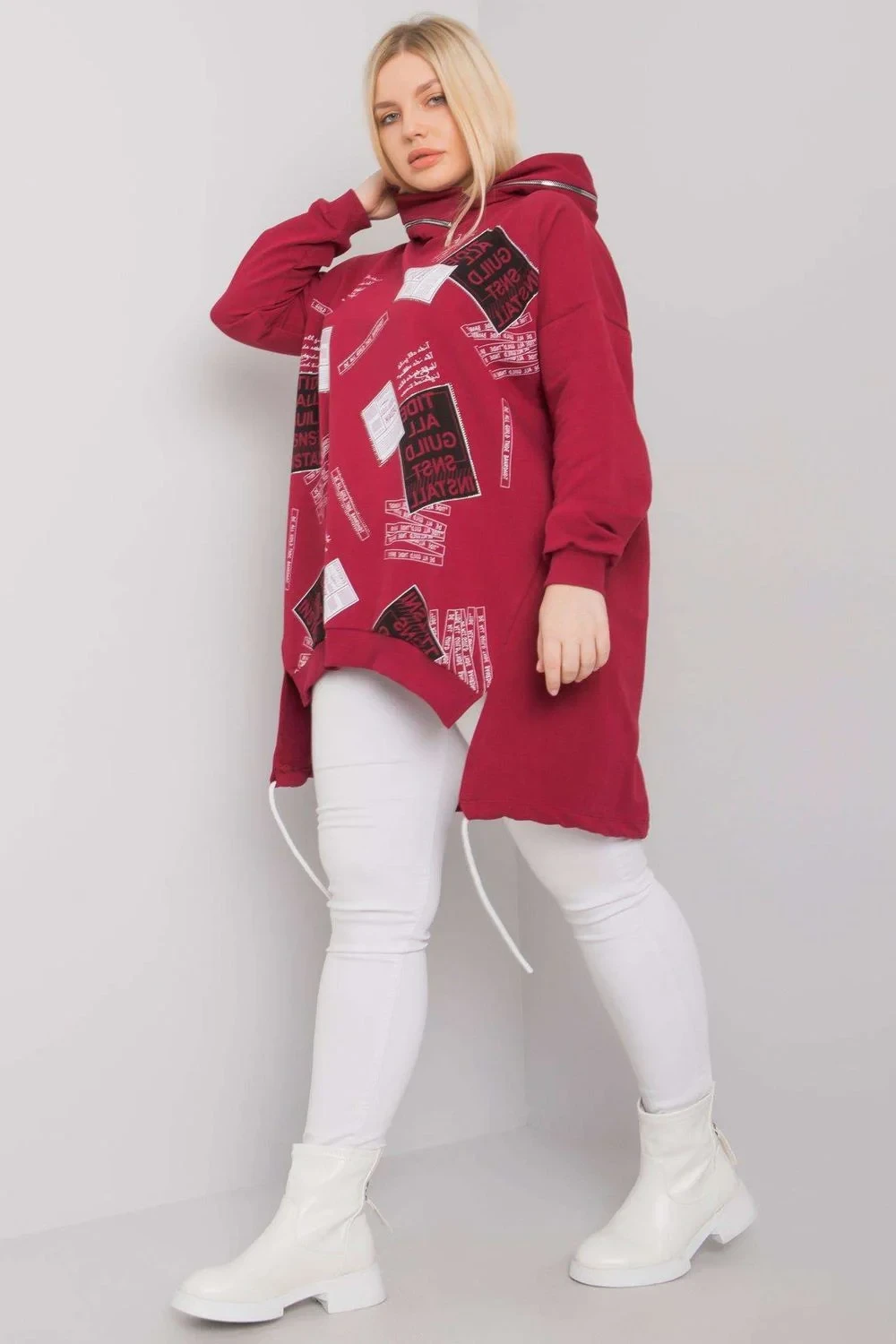 Bordó mikina s potiskem a aplikací. Mikina má kapuci a dlouhé rukávy.
