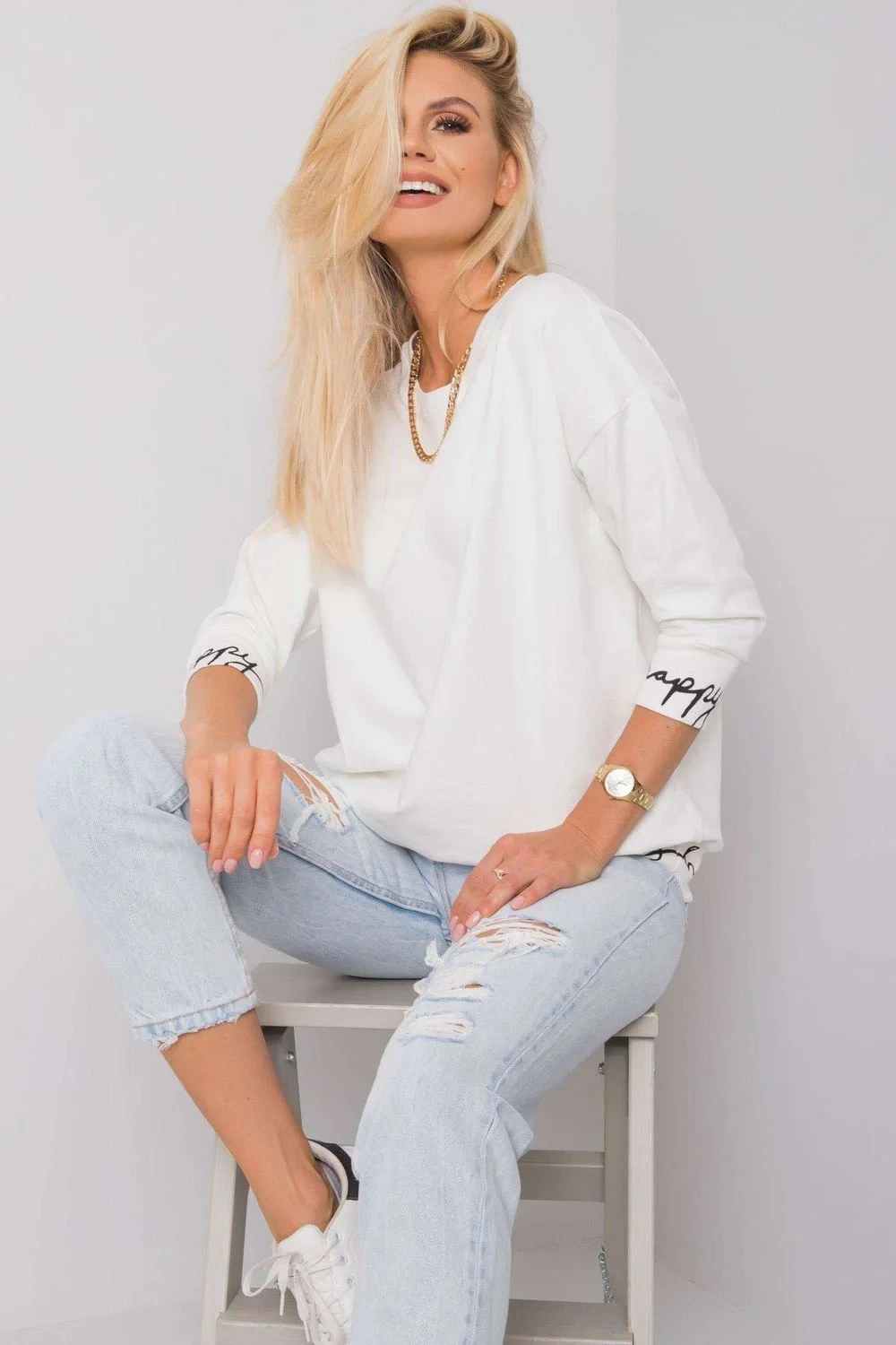 Mikina v barvě ecru s nápisy na manžetách. Halenka s 3/4 rukávy.