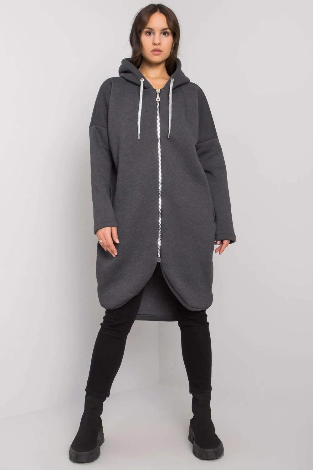Dámská mikina s prodlouženým střihem a dlouhými rukávy. Mikina má asymetrickou spodní část, zapínání na zip a kapuci. Kapsy na zip po stranách.