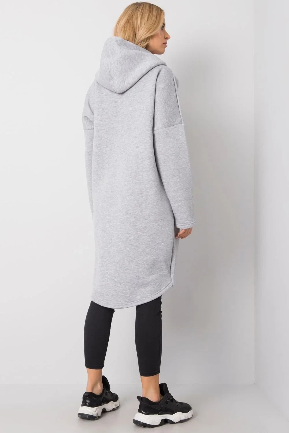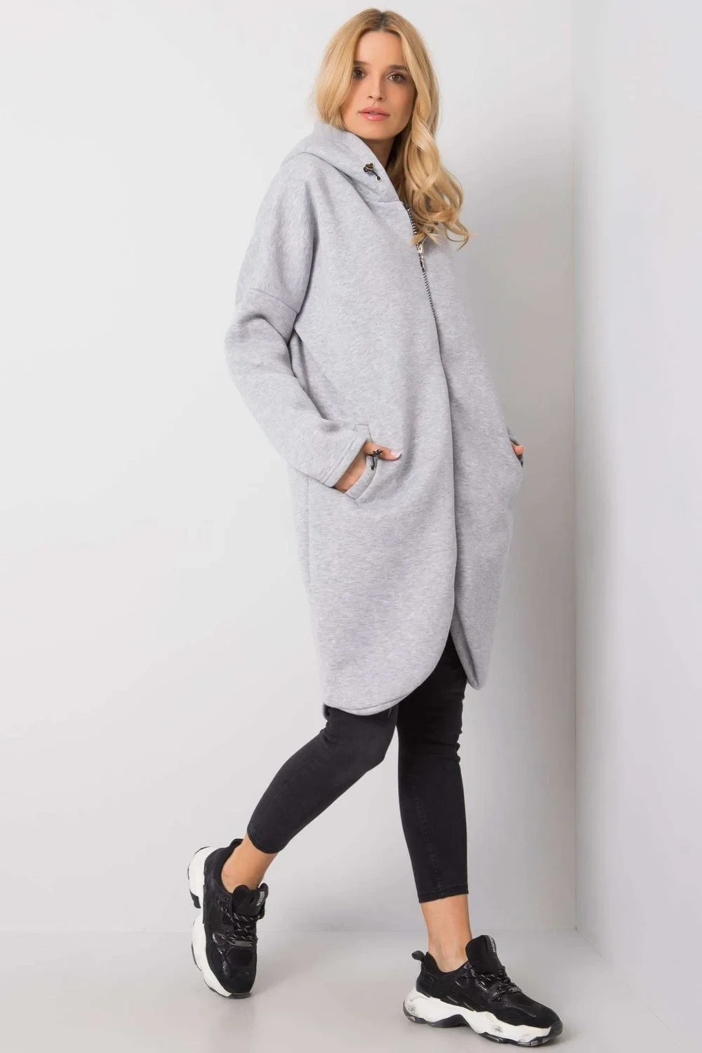 Mikina s prodlouženým střihem a zapínáním na zip. Mikina s dlouhými rukávy a kapucí. Kapsy na bocích.