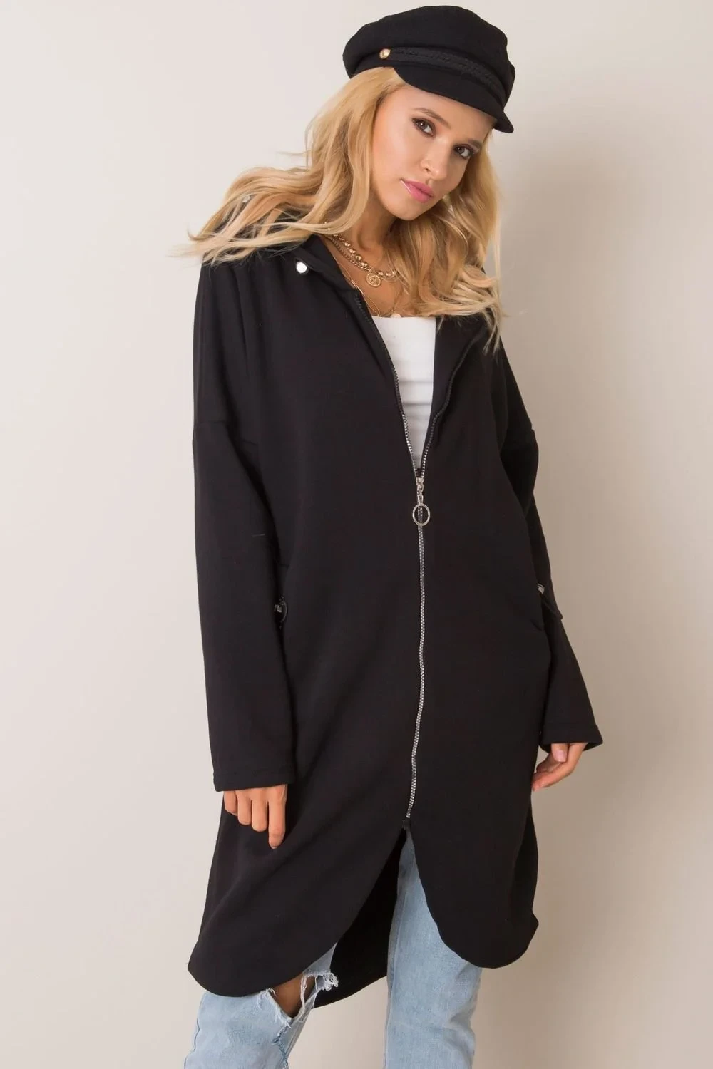 Mikina s prodlouženým střihem a zapínáním na zip. Mikina s dlouhými rukávy a kapucí. Kapsy na bocích.