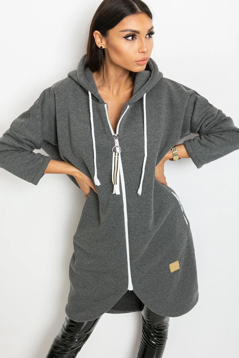 Dámská mikina s prodlouženým střihem, dlouhými rukávy a kapucí. Mikina se zapíná na zip a po stranách má kapsy na zip.