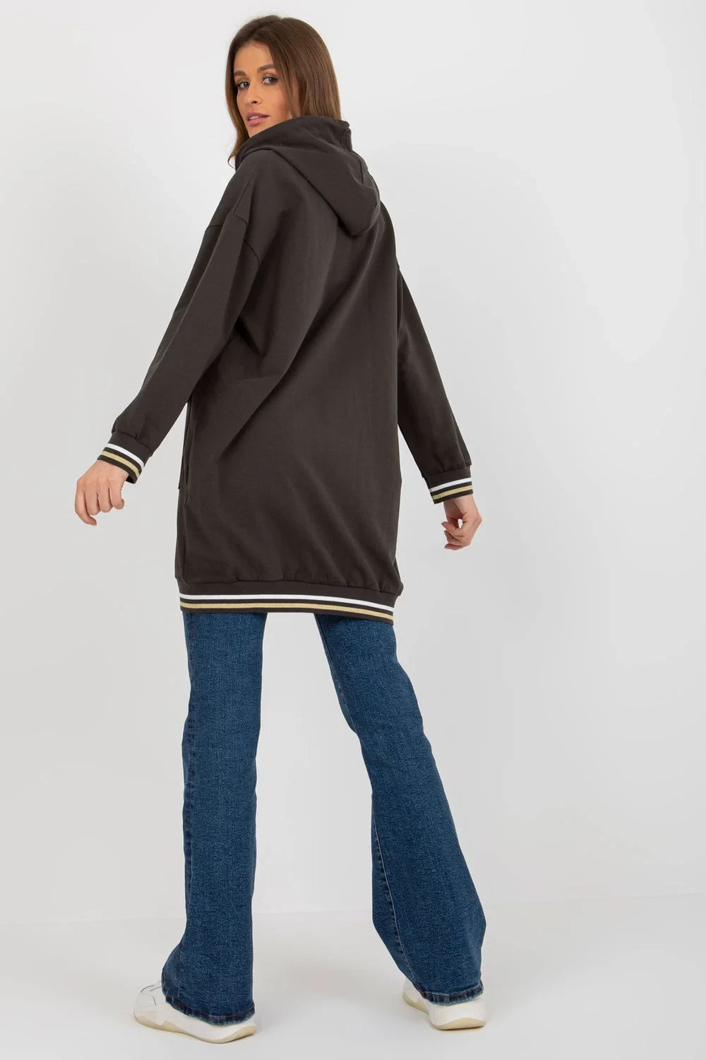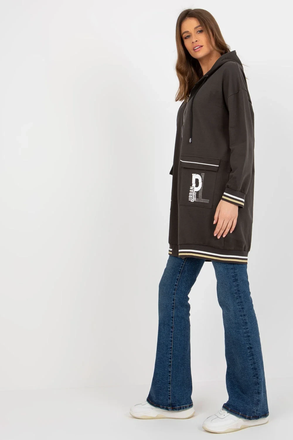 Dámská mikina prodlouženého střihu s dlouhými rukávy a kapucí. Mikina má zapínání na zip a velké nakládané kapsy na přední straně.