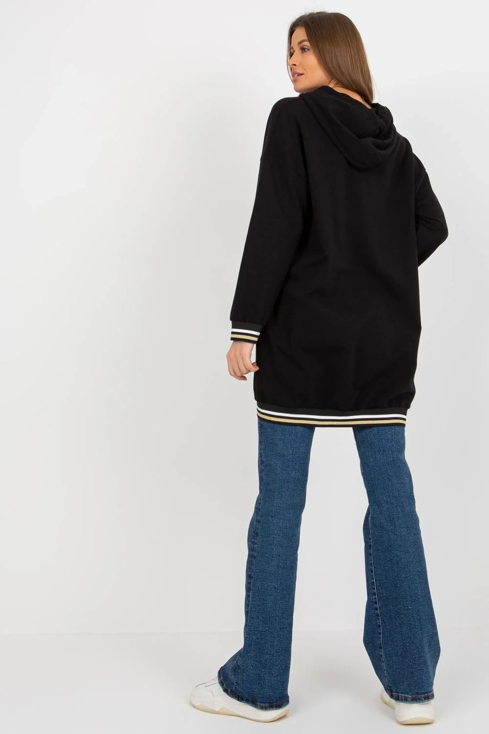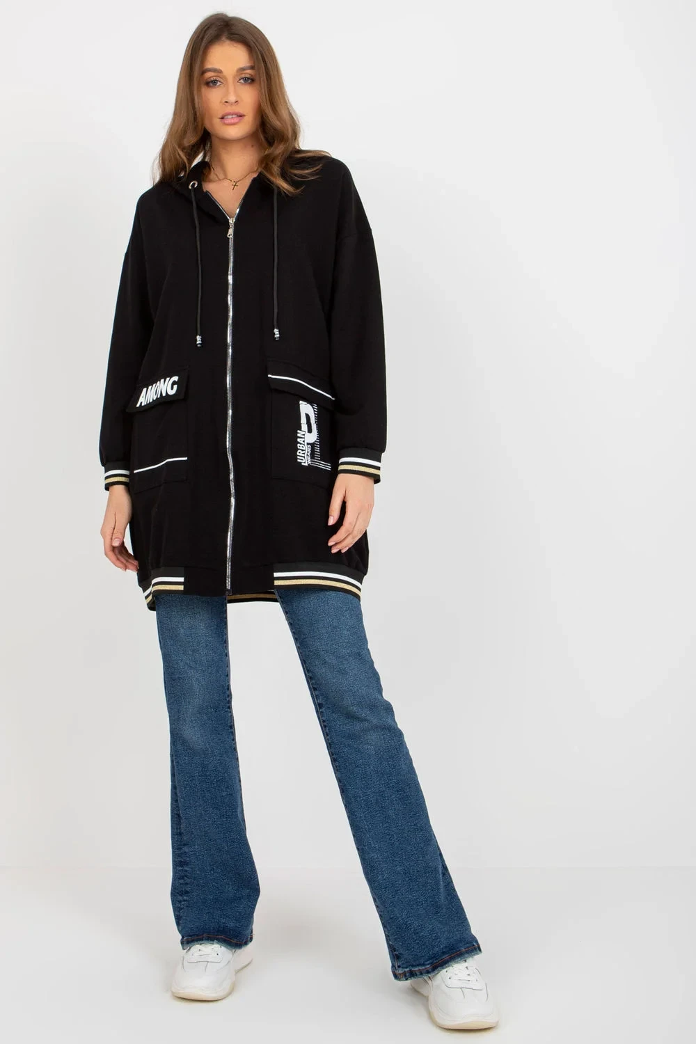 Dámská mikina prodlouženého střihu s dlouhými rukávy a kapucí. Mikina má zapínání na zip a velké nakládané kapsy na přední straně.