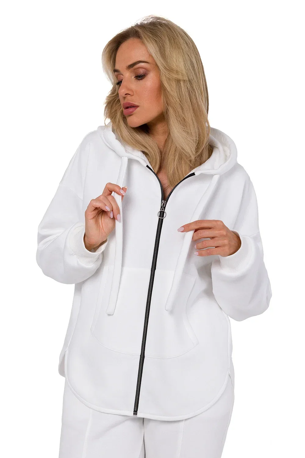 Dámská pletená mikina se zapínáním na zip. Halenka s dlouhými rukávy, mírně prodloužená záda. Klokaní kapsa na přední straně. Navrženo a ušito v Polsku.