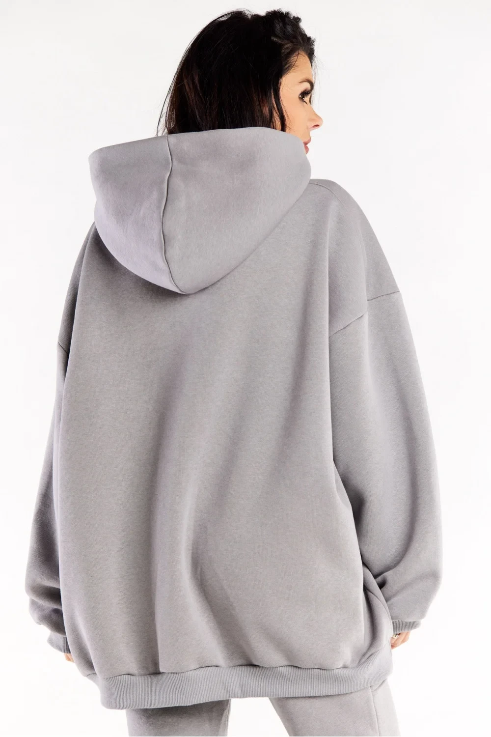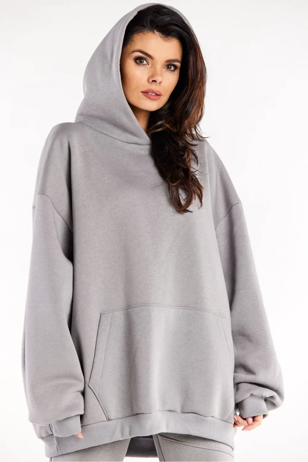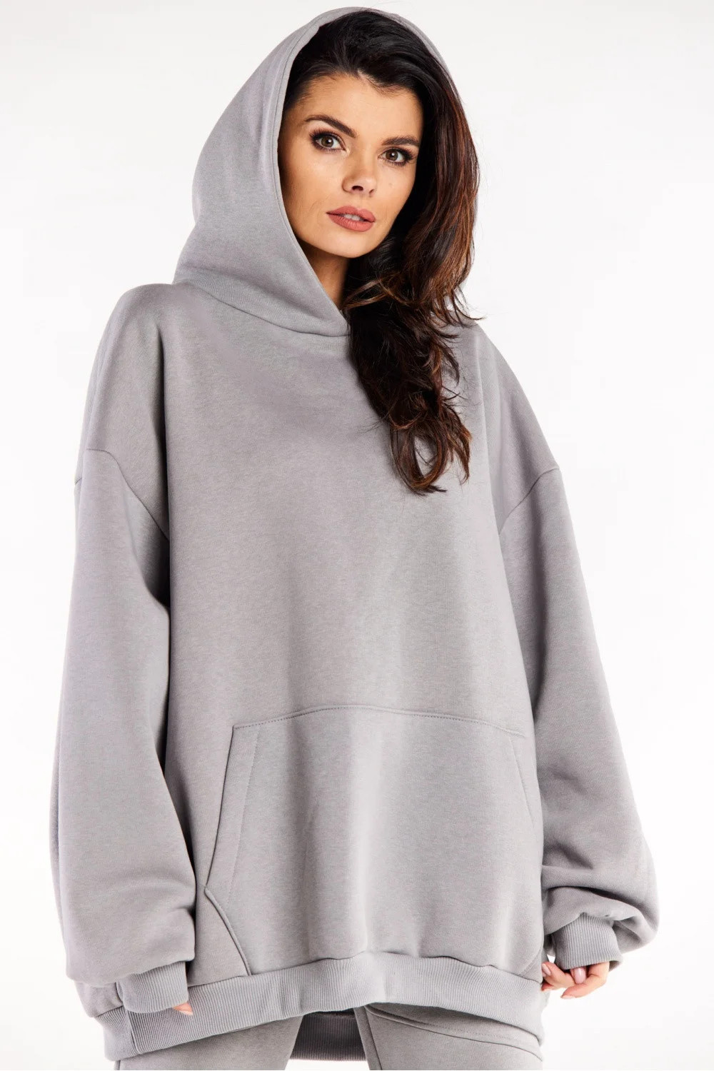 Mikina nadměrné velikosti s dlouhými rukávy, klokaní kapsou a prostornou kapucí.