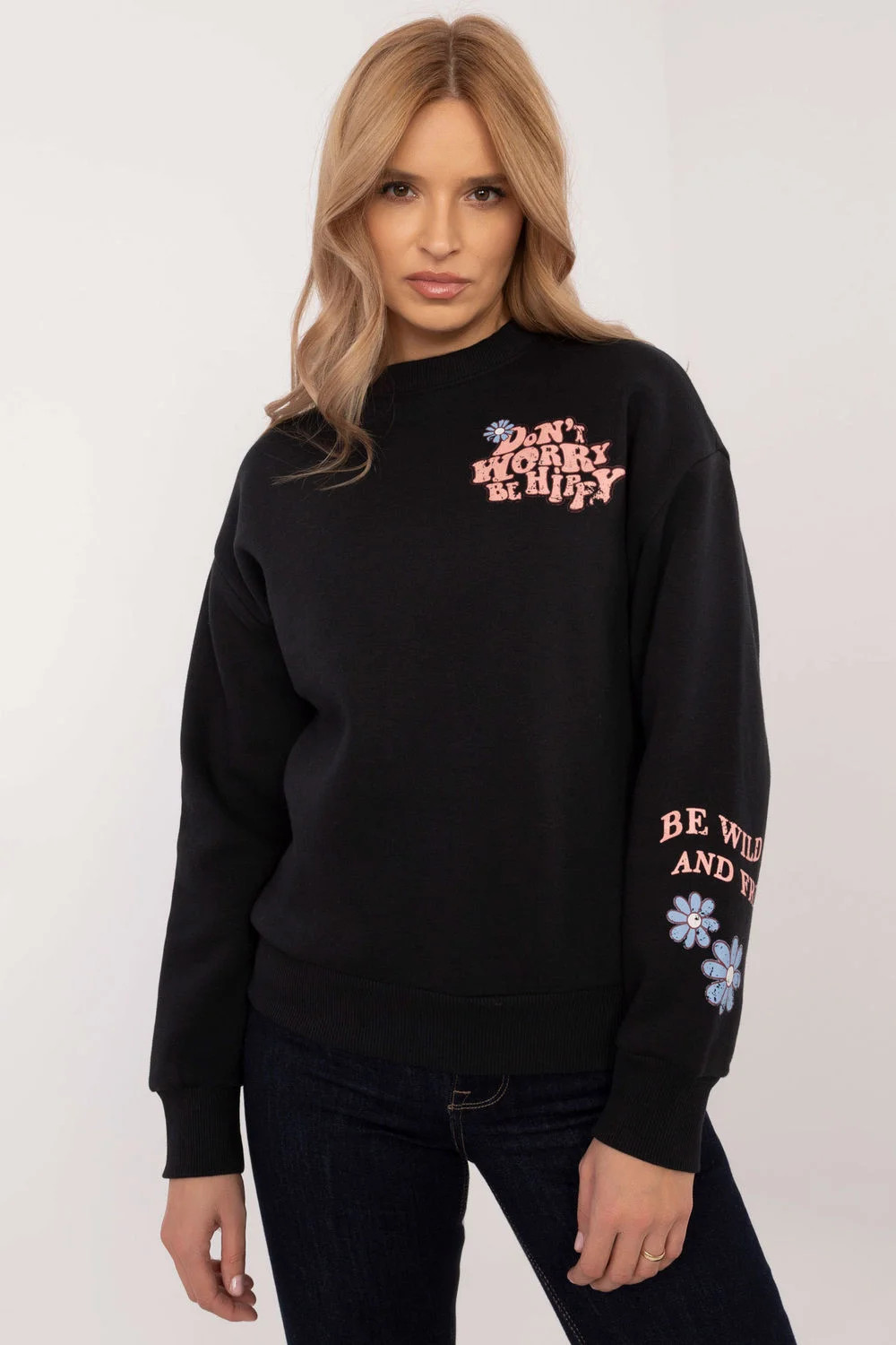 Pohodlná a stylová dámská mikina, ideální pro každodenní nošení. Je vyrobena z měkké a odolné kombinace bavlny a polyesteru a poskytuje pohodlné nošení a příjemné teplo v chladnějších dnech. Díky ležérnímu stylu se mikina skvěle hodí k různým každodenním outfitům. Model má standardní délku, dlouhé rukávy a klasický kulatý výstřih, což z něj činí univerzální volbu. Originální potisky na přední a zadní straně a na rukávech dodávají mikině jedinečný charakter. Absence zapínání podtrhuje pohodlný a volný střih. Ideální volba pro ženy, které si cení pohodlí a módního vzhledu v ležérních kombinacích. Skvěle se hodí k džínům, legínám nebo teplákům.