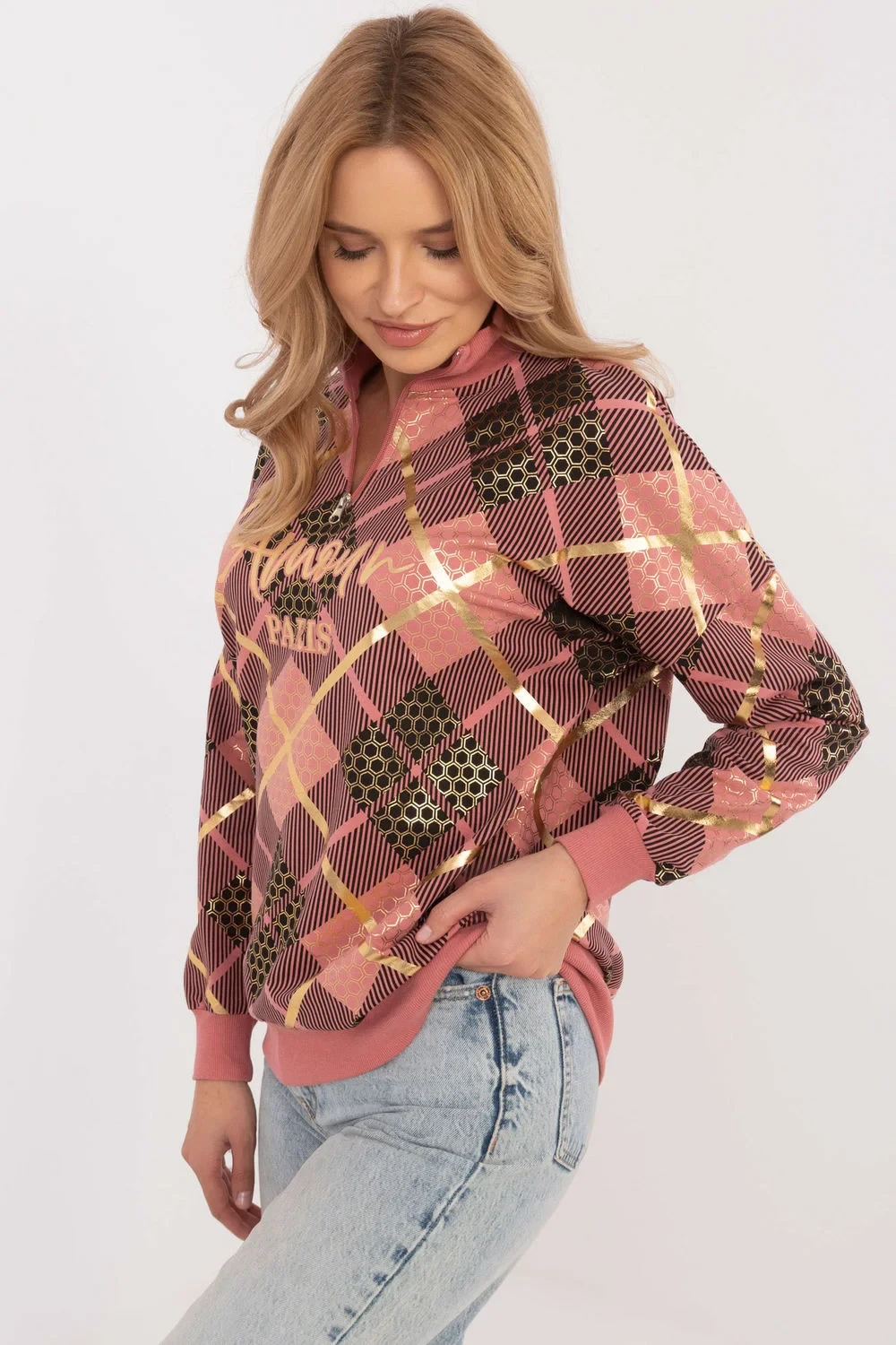 Elegantní dámská mikina s casual charakterem je ideální kombinací pohodlí a módního designu. Dominantní károvaný vzor jí dodává zvláštní kouzlo a skvěle se hodí jak na každý den, tak do volnějších stylizací. Mikina je vyrobena z měkké bavlny s přídavkem elastanu, díky čemuž je příjemná na dotek, prodyšná a elastická, co zajišťuje maximální pohodlí při nošení. Standardní délka a dlouhý rukáv ji dělají univerzálním kouskem šatníku. Model je vybaven praktickým stojáčkem se zipem, který nejen zdůrazňuje sportovní charakter mikiny, ale také chrání před chladem v chladnějších dnech. Je to skvělá volba pro ženy, které ocení styl a pohodlí ve svých každodenních stylizacích.