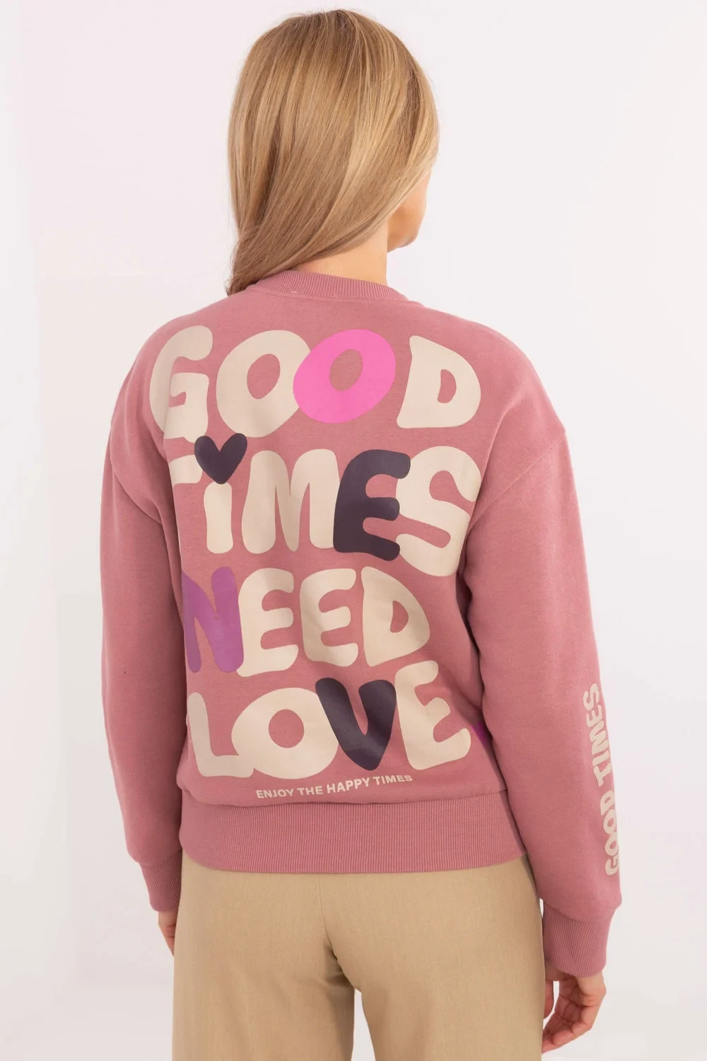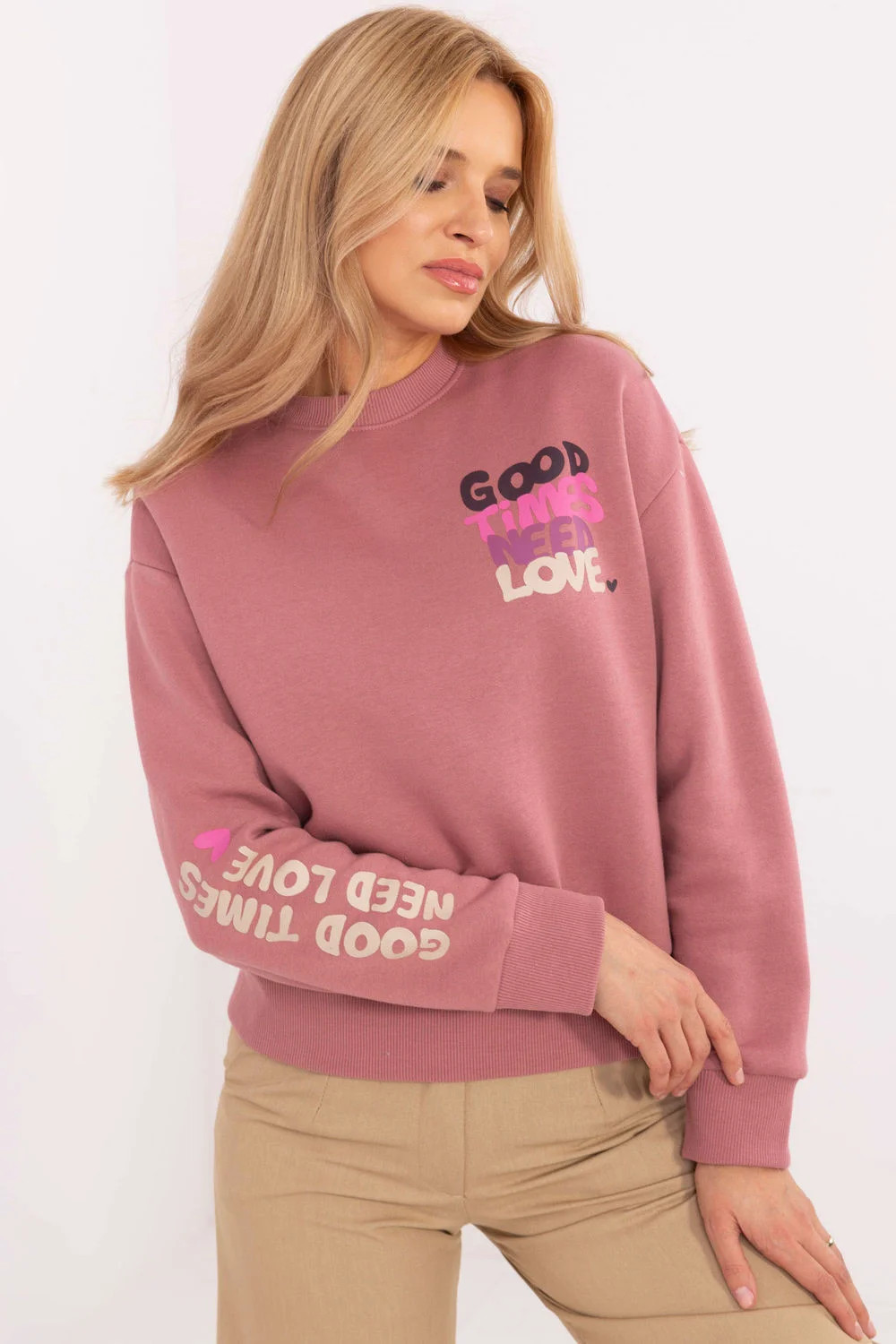 Dámská volná mikina je kombinací pohodlí a stylu, ideální na každodenní aktivity. Vyrobená z vysoce kvalitní směsi bavlny a polyesteru, zaručuje trvanlivost, měkkost a pohodlí nošení. Model s standardní délkou a dlouhými rukávy se skvěle hodí na chladnější dny a dodatečné zahřátí zajistí další ochranu před chladem. Mikina se vyznačuje originálním designem díky potiskům a nápisům, které zdobí záda, přední část a rukávy. Klasický kulatý výstřih jí dodává univerzální charakter, který se hodí k různým stylizacím. Bez zapínání zdůrazňuje její minimalistický a praktický střih. Je to ideální volba pro volný styl, který skvěle ladí s džíny, kalhotami nebo legíny, nabízející módní vzhled a plnou volnost pohybu.