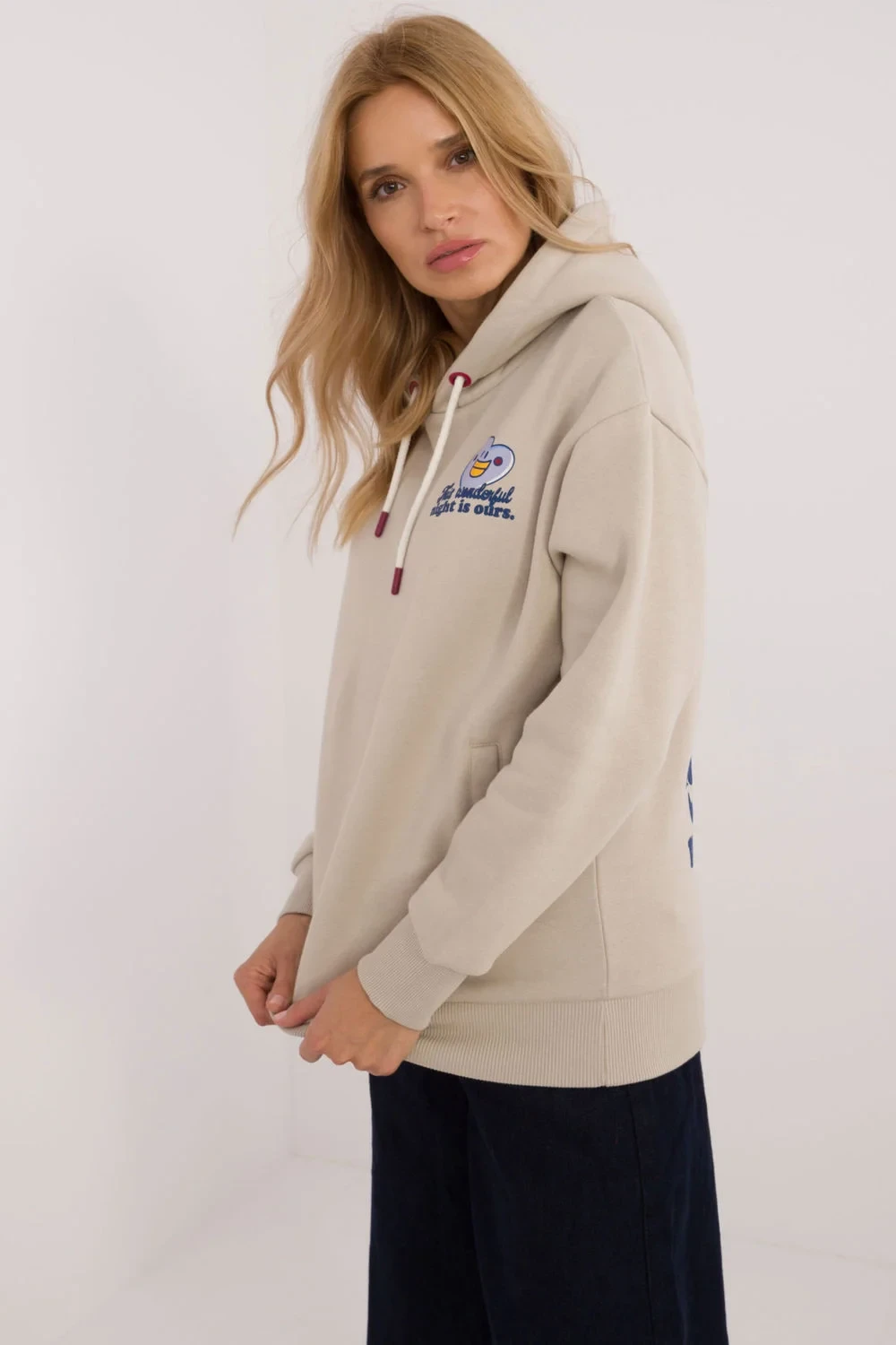 Dámská mikina v casual stylu, ideální na každý den, vyrobená z kombinace bavlny a polyesteru, poskytuje pohodlí a odolnost. Vyznačuje se potiskem na zádech, malým potiskem vpředu a nápisem na rukávu, které jí dodávají moderní a módní vzhled. Má standardní délku, dlouhé rukávy a praktickou kapuci, ideální pro chladnější dny. Vložené kapsy nabízejí další funkcionalitu a prošívaní uvnitř poskytuje teplo a pohodlí nošení. Je to skvělá volba na každodenní vycházky, kdy chcete spojit styl a pohodlí.