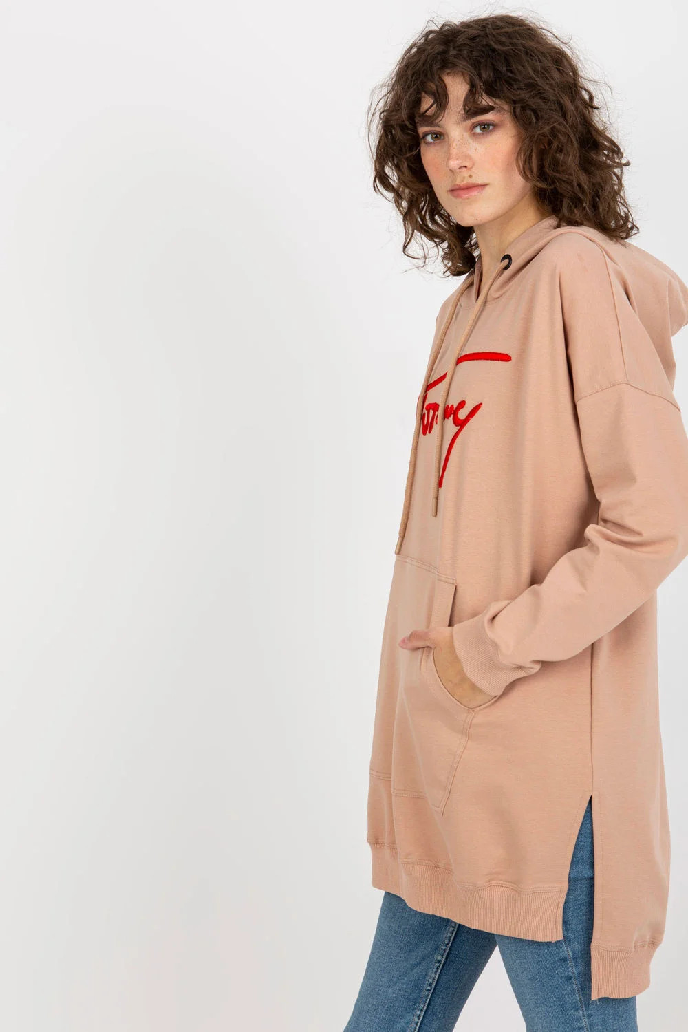 Dlouhá dámská mikina s casual charakterem je ideální volbou na každý den, spojující pohodlí s minimalistickým stylem. Model se vyznačuje hladkým, dominujícím vzorem, který dodává univerzálnost a umožňuje snadné sladění mikiny s různými stylizacemi. Vyrobená z vysoké kvality směsi bavlny, polyesteru a elastanu, poskytuje pohodlí, trvanlivost a jemné přizpůsobení. Mikina má prodloužený střih s jemnými rozparky po bocích, které dodávají lehkost a módní vzhled. Dlouhý rukáv a praktická kapuce zajišťují ochranu a pohodlí v chladnějších dnech. Na přední straně je aplikace, která představuje stylový akcent, a funkční kapsa typu klokan, ideální na drobnosti nebo ohřátí rukou. Jedná se o nezbytný prvek šatníku pro ženy, které oceňují styl a praktičnost.