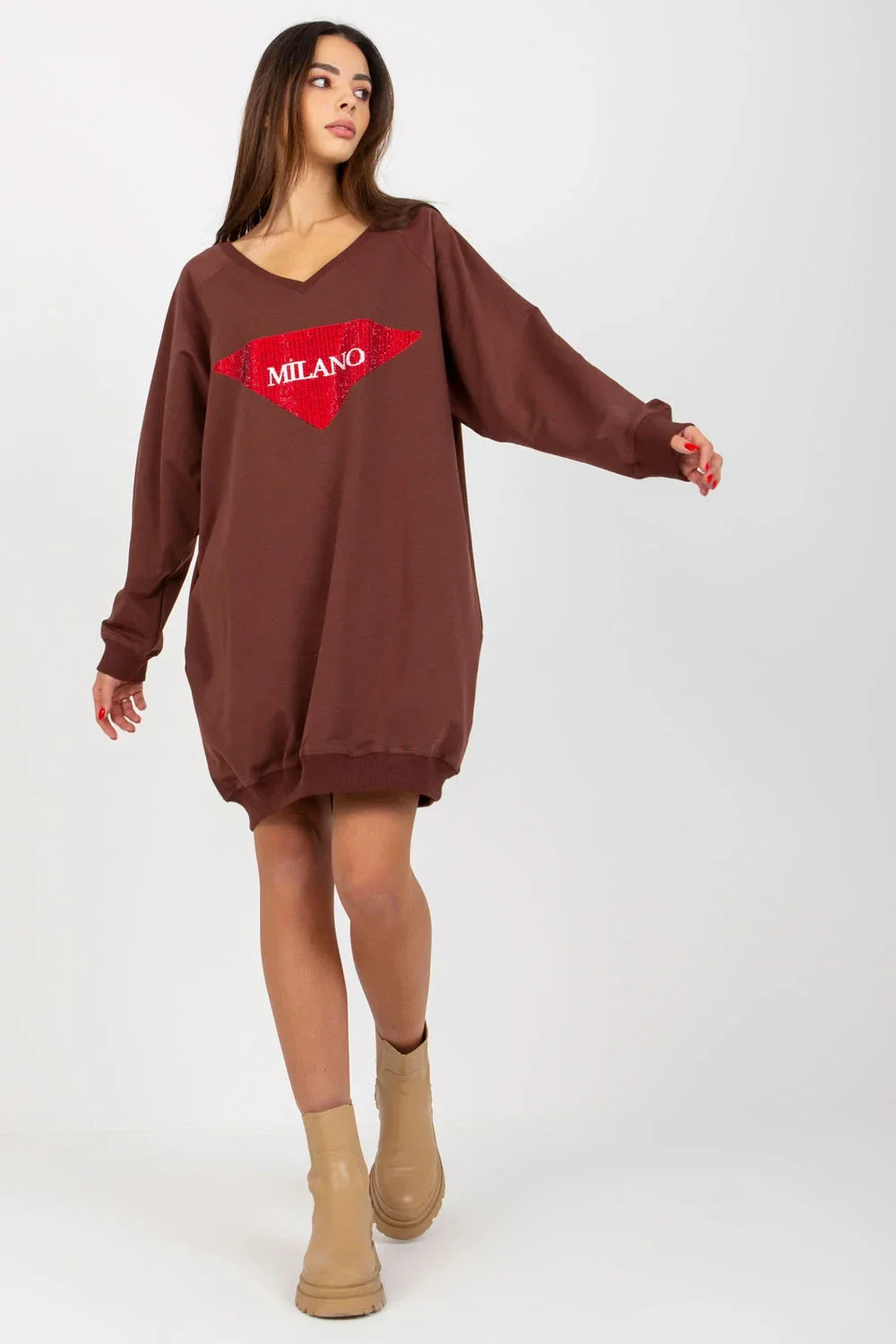 Dlouhá dámská mikina v casual stylu je kombinací pohodlí a efektního designu. Vyniká dominujícím potiskem na přední straně, zdobeným moderními flitry, které jí dodávají výjimečný charakter a decentní lesk. Mikina byla ušita z vysoce kvalitní směsi bavlny, polyesteru a elastanu, co zaručuje pohodlí nošení, odolnost a jemné přizpůsobení siluetě. Model s prodlouženou délkou a s výstřihem do V zajišťuje volnost pohybu a stylový vzhled. Dlouhý rukáv dělá mikinu ideální na chladnější dny, a praktické kapsy skryté v bočních švech dodávají funkčnost. Absence zapínání zdůrazňuje její casualový charakter, čímž se stává skvělou volbou na každý den, ať už k džínům, legínám nebo elegantnějším kalhotám.