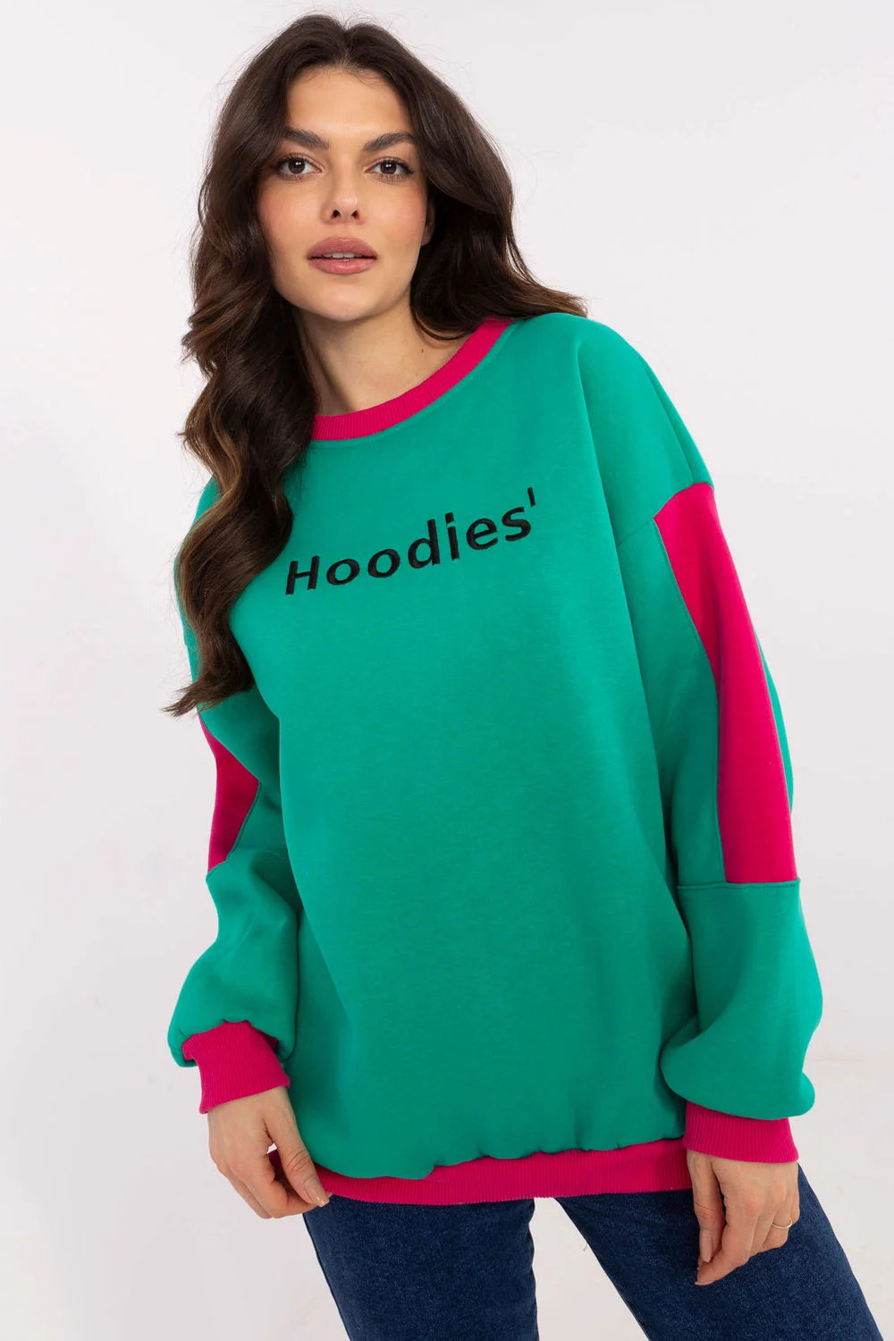 Casualová dámská mikina s klasickým a univerzálním střihem, ideální na chladnější dny. Vyrobená z kombinace bavlny a polyesteru, zaručuje pohodlí nošení, měkkost a trvanlivost. Model standardní délky s dlouhými rukávy zdobenými kontrastními vložkami, které dodávají celku moderní charakter. Mikina má kulatý výstřih a bez zapínání zdůrazňuje její pohodlný, volný styl. Další výhodou je zateplení, které zajišťuje teplo v chladnějších dnech. Na přední straně je výšivka v podobě nápisu, která jí dodává výjimečný, módní akcent. Ideální na každodenní nošení, k džínám nebo legínám.