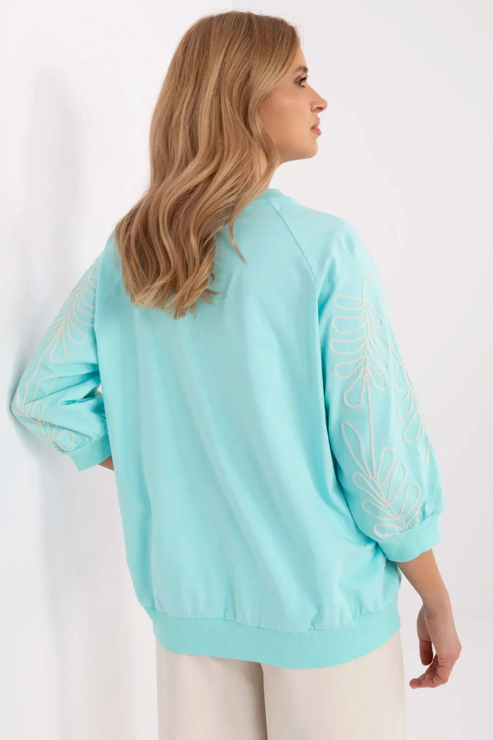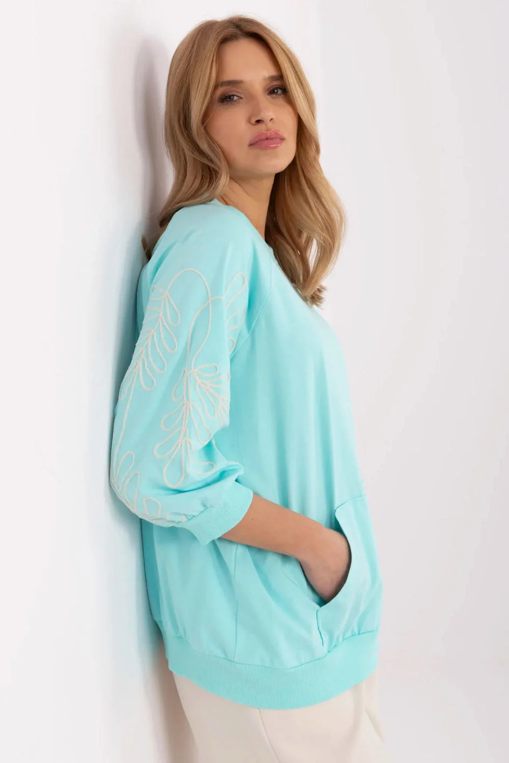 Dámská mikina v casual stylu, ideální na každý den a do práce. Vyrobená z měkkého, příjemného na dotek materiálu, poskytuje pohodlí po celý den. Originálním prvkem je dekorativní vyšívání na rukávech, které jí dodává jemnou eleganci. Model s rukávem 3/4 je skvělou volbou na různá roční období. Mikina má praktickou kapsu typu klokaní na přední straně, co zdůrazňuje její volný, městský charakter. Skvěle se hodí k outfitu s kalhotami nebo sukní, spojující pohodlí s trendy vzhledem.