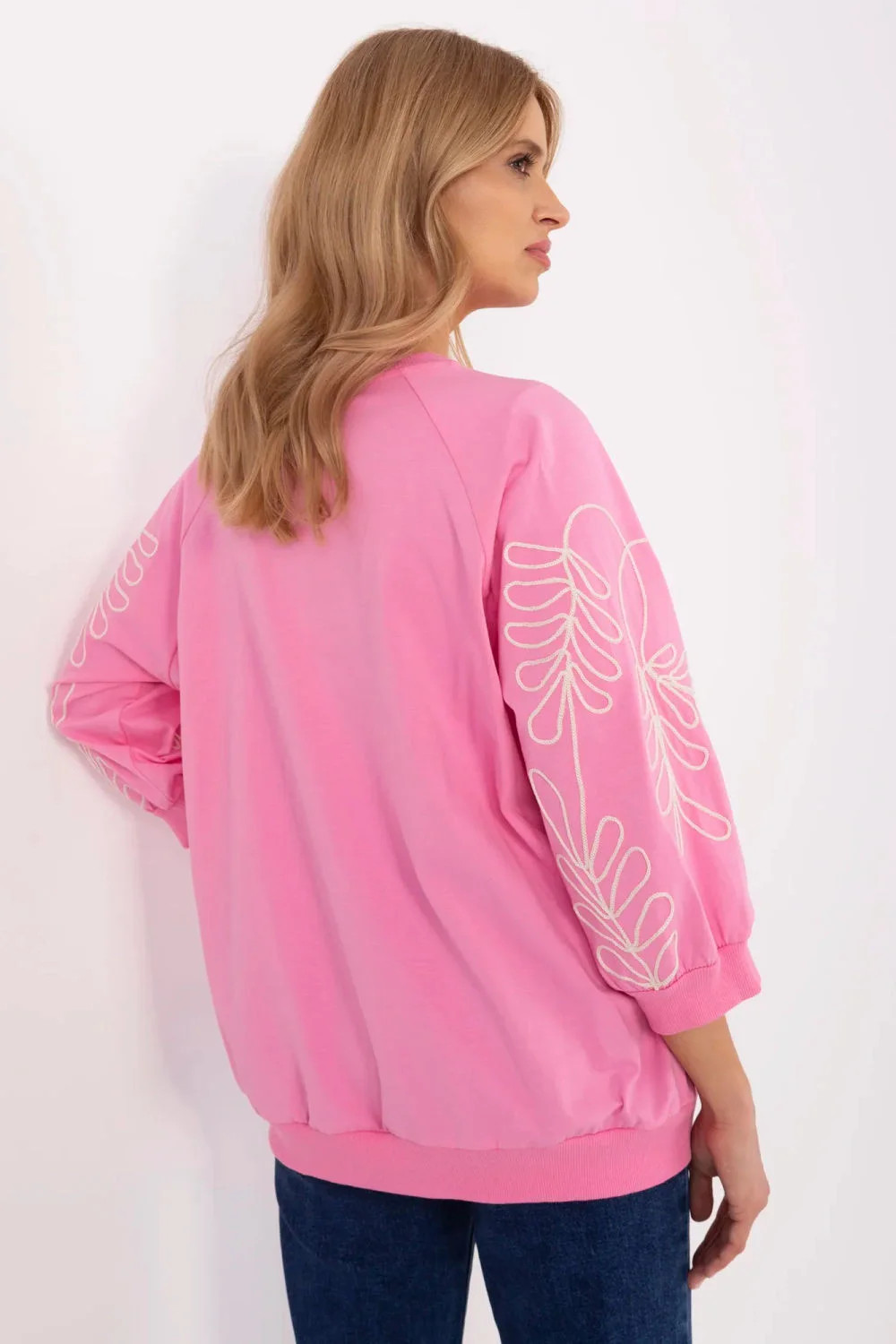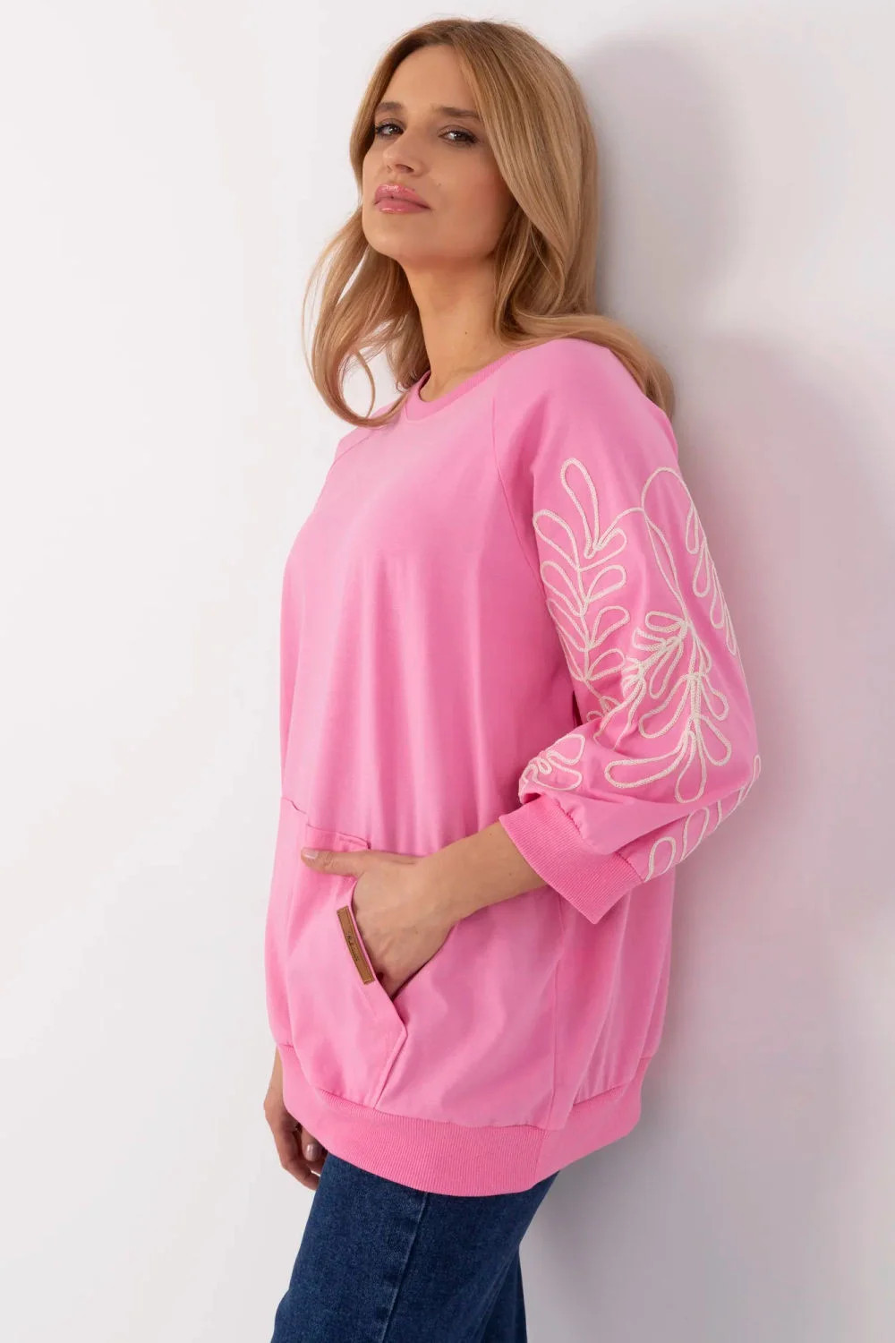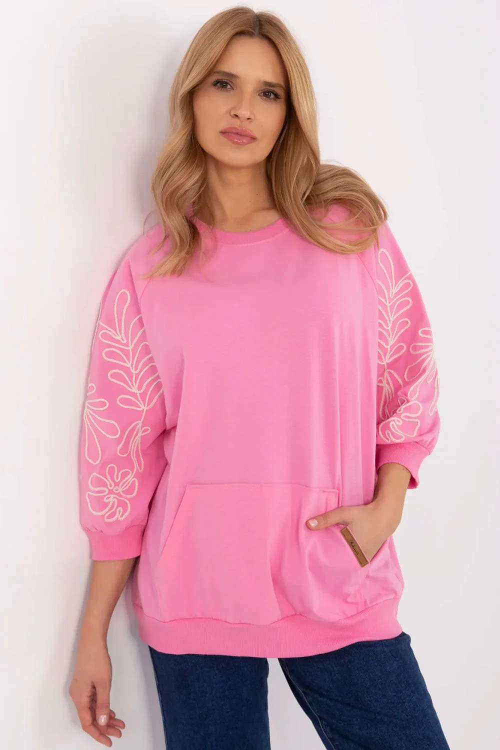 Dámská mikina ve casual stylu, ideální na každý den i do práce. Vyrobená z měkkého, příjemného na dotek materiálu, poskytuje pohodlí po celý den. Originálním akcentem je dekorativní vyšívání na rukávech, které ji dodává jemnou eleganci. Model s 3/4 rukávem je skvělou volbou na různá období roku. Mikina má praktickou kapsu typu klokánek vpředu, co zdůrazňuje její volný, městský charakter. Skvěle se hodí k outfitu s kalhotami nebo sukní, spojující pohodlí s trendy vzhledem.
